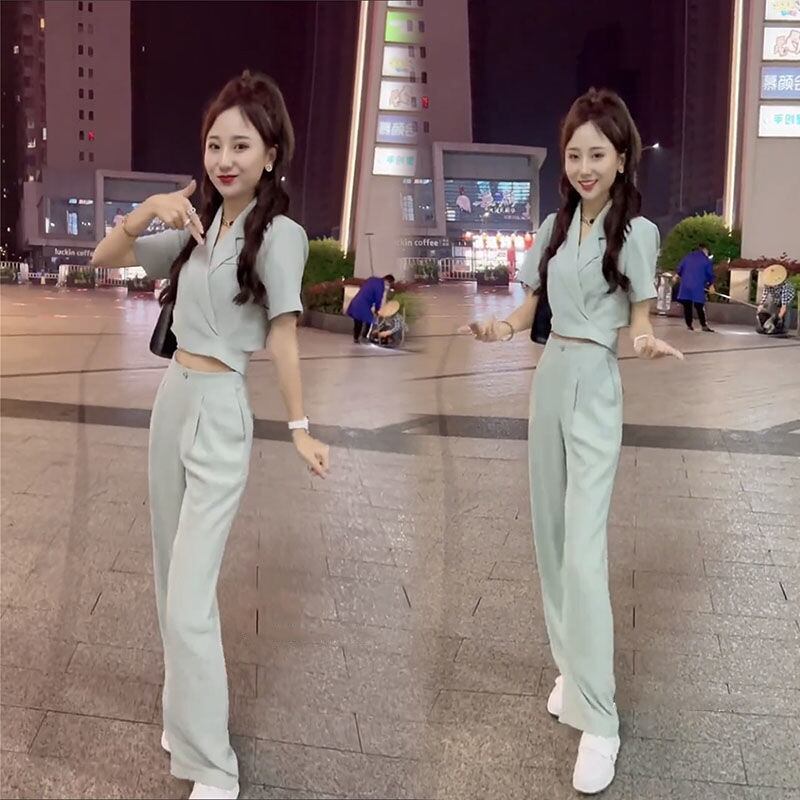 オフィスレディ夏フレンチスタイルスーツ半袖レースアップコートウエストワイドレッグパンツ2点セットFshion服 サマー 夏物 ワイドパンツ 会社 学校 通勤や通学にも