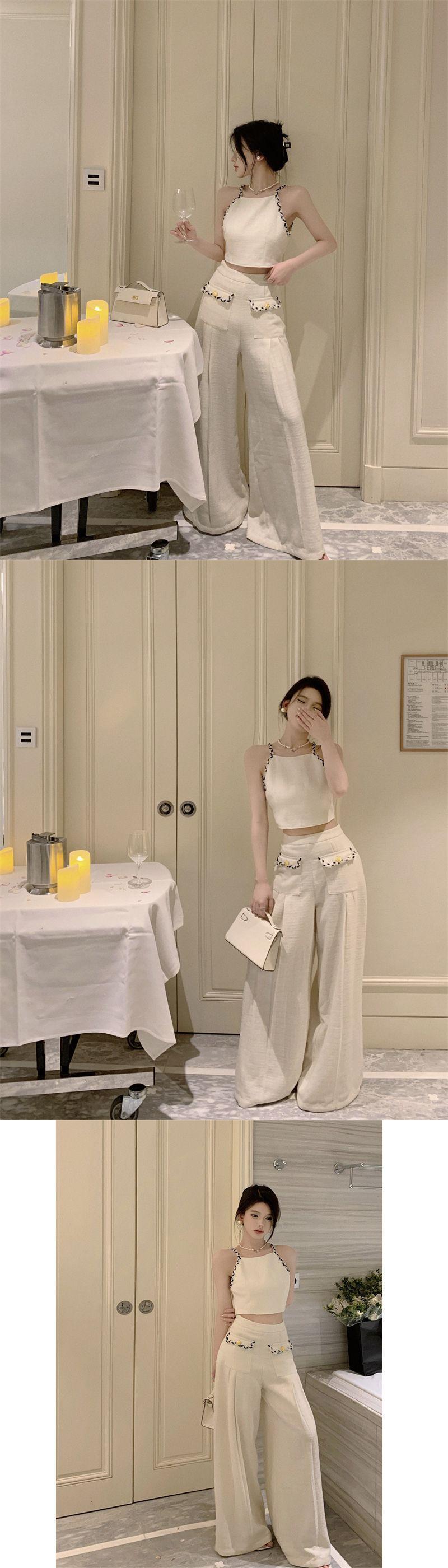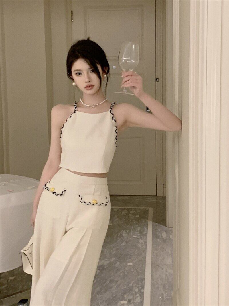 フランスオフィスレディスーツショートストラップトップウエストワイドレッグパンツ純粋セクシーツーピースセット服 ワイドパンツ ピュア 会社 学校 通勤や通学にも