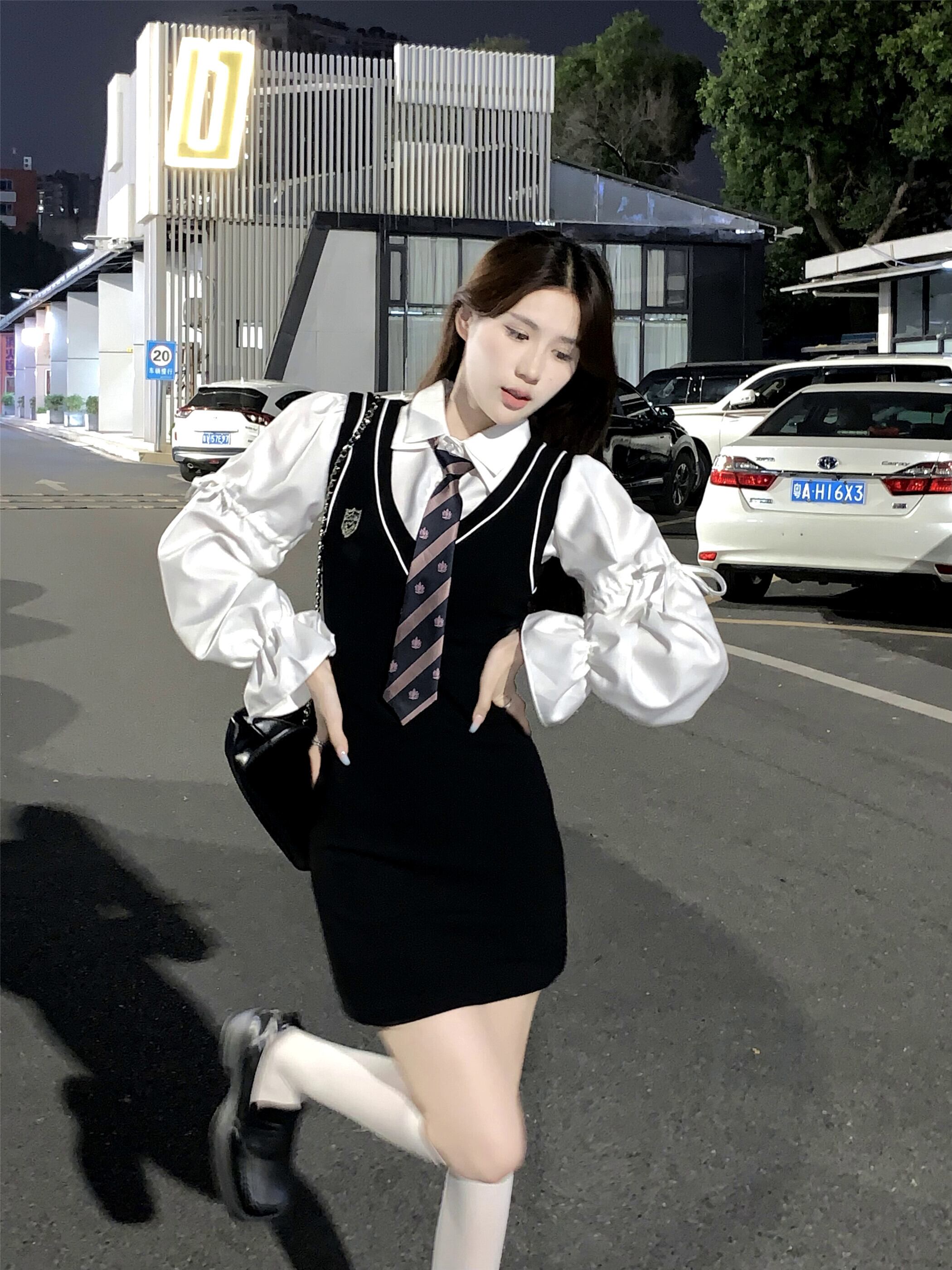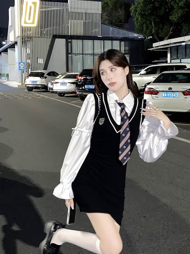 Gothiscyn 冬ショートスカートセット白シャツニット黒ドレス 2 点セットプレッピー衣装 ホワイト ブラック ウィンター 冬物
