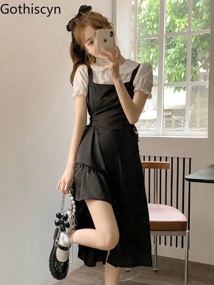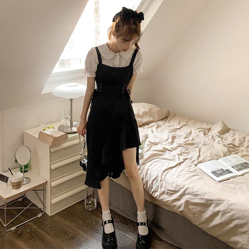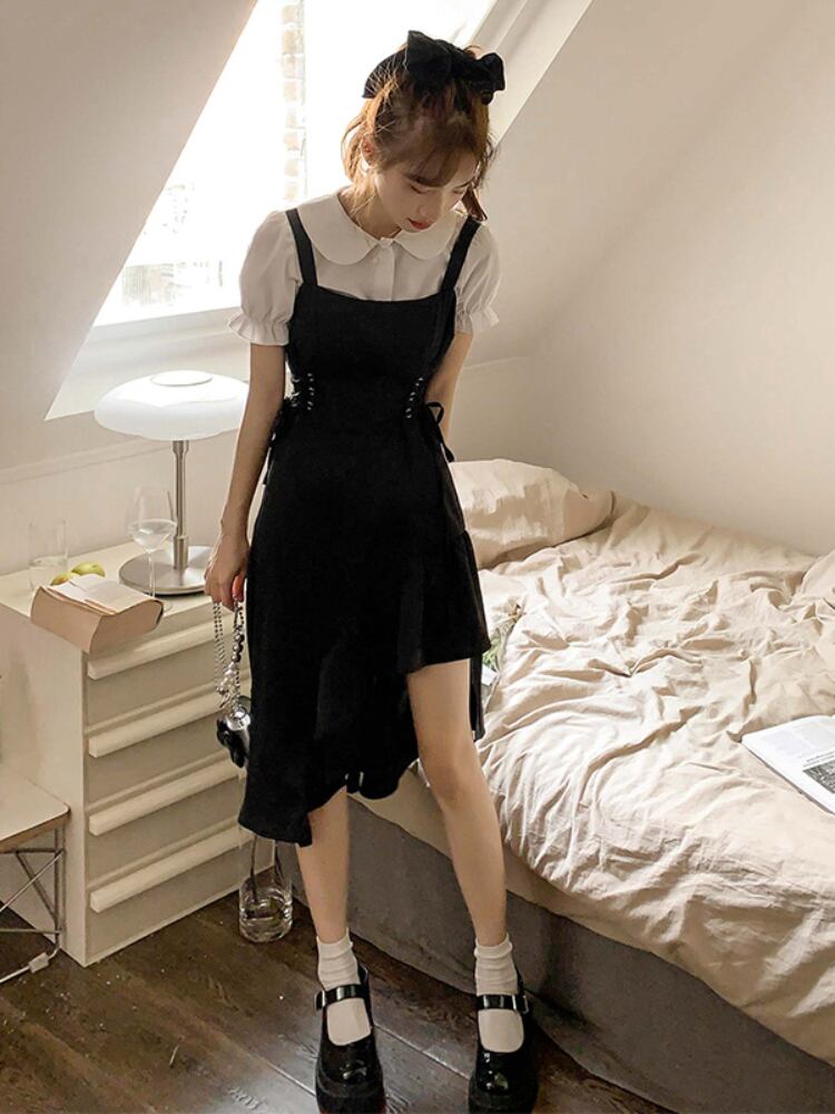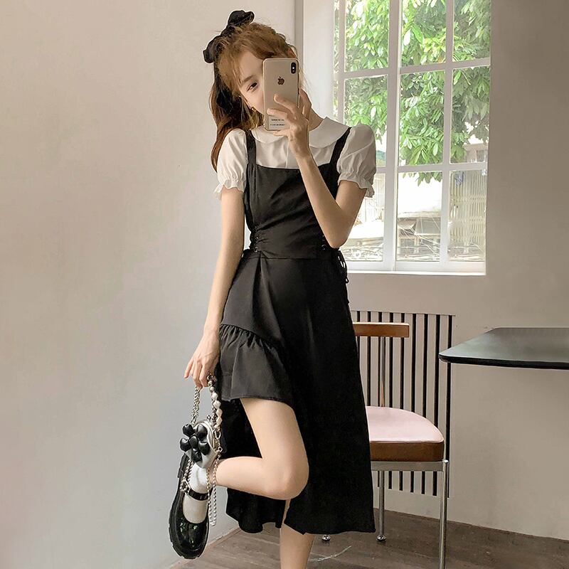 Gothiscyn ストラップドレス ツーピース スーツ スウィート ホット ガール 花柄ドレス ブラック サマー ウエスト アート ソリッド フレア スリーブ オフィス レディー フレアスリーブ 大人ガーリー キュート カジュアル 夏物 ソリッドカラー 会社 学校 通勤や通学にも