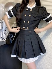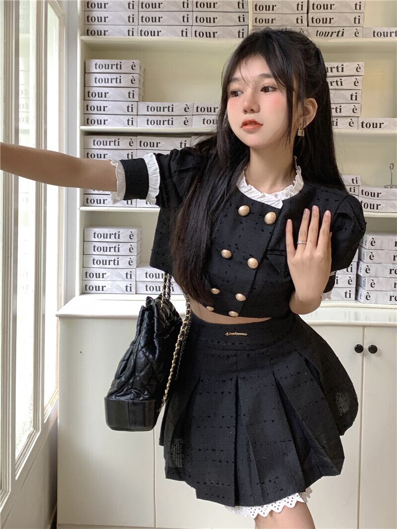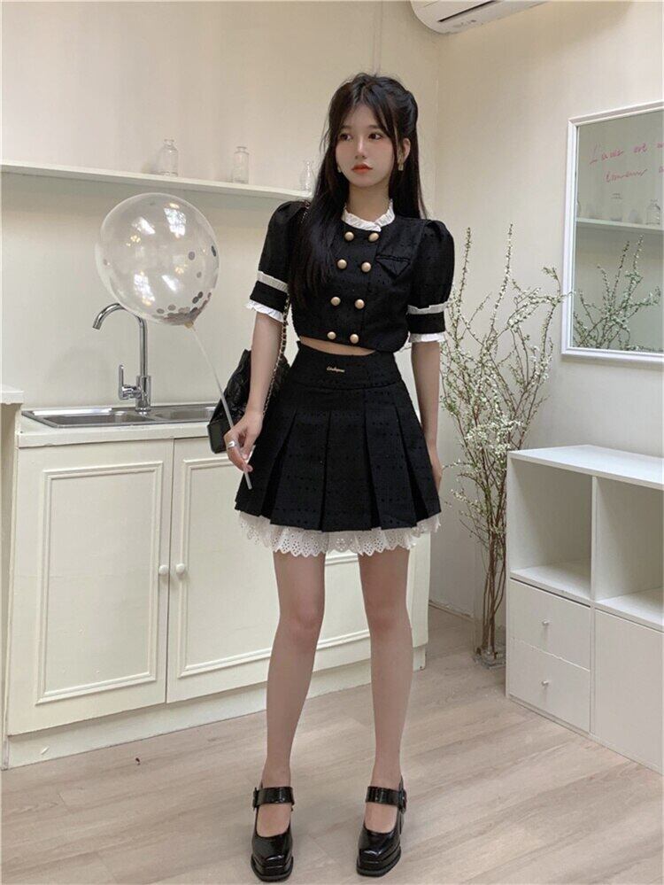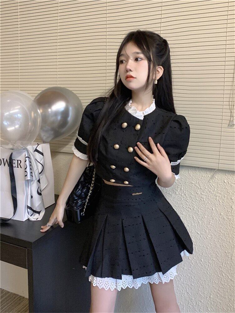 Gothiscyn スイート スパイシー スカート セット パフ スリーブ シャツ サマー プリーツ スカート ツーピース スーツ 大人ガーリー スウィート キュート カジュアル 夏物