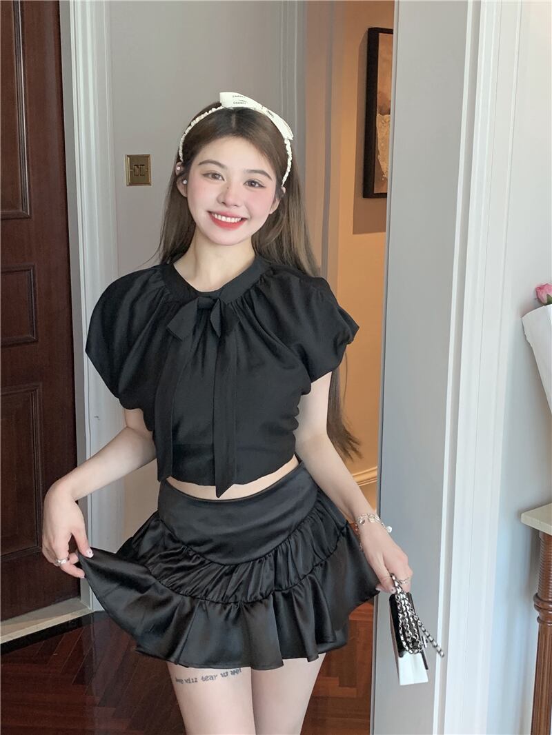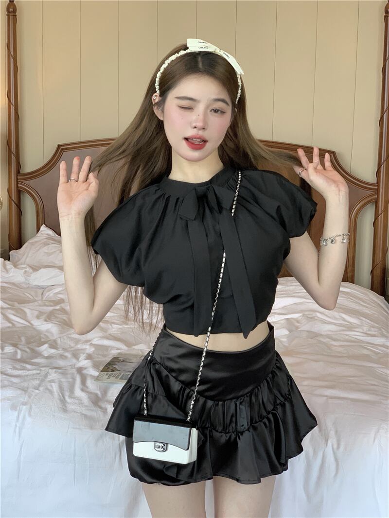 ホットガールスーツレースアップ背中開いたパフスリーブトップウエスト A ラインスカートショーツ 2 点セット服 ブルマー Aライン