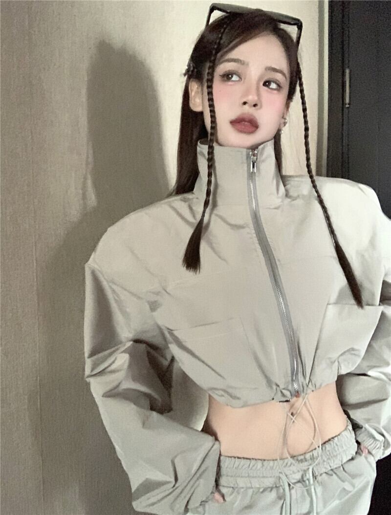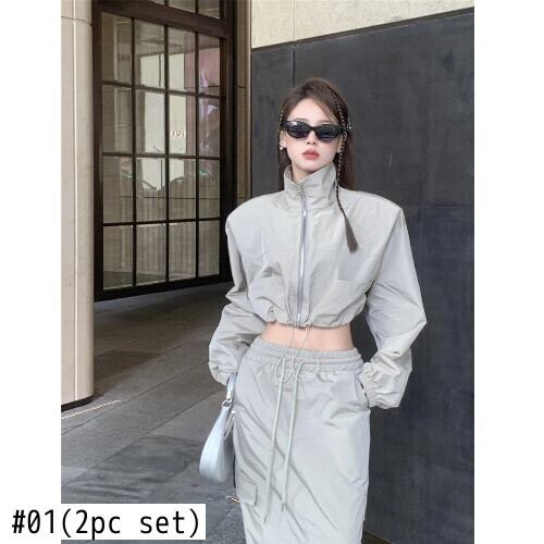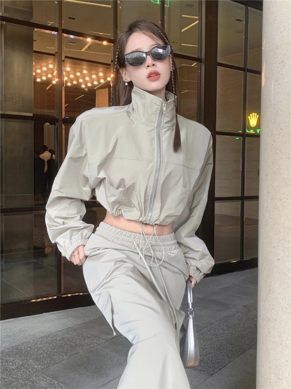 ホットガールスーツルーズ日焼け止めジッパーコート夏弾性ウエストスプリットスカートツーピースセット服 エラスティック 伸縮 サマー 夏物