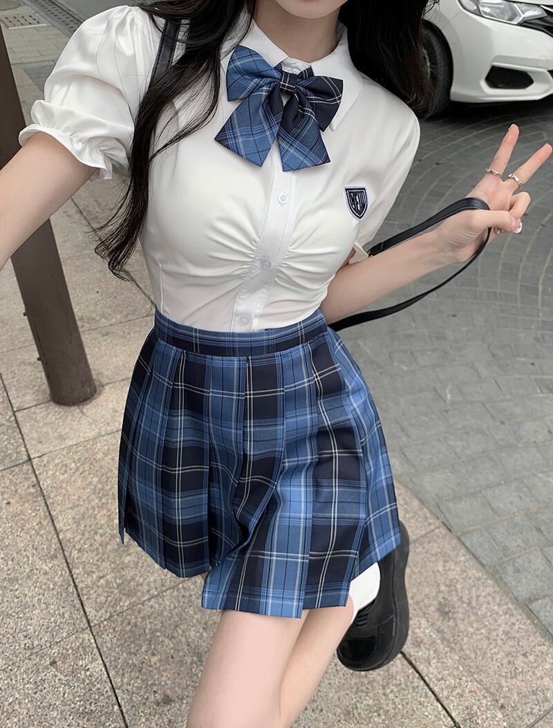 スタイル JK スーツ レディース 夏半袖白シャツ チェック柄 A ライン プリーツ スカート 2 点セット服 ホワイト サマー 夏物 Aライン