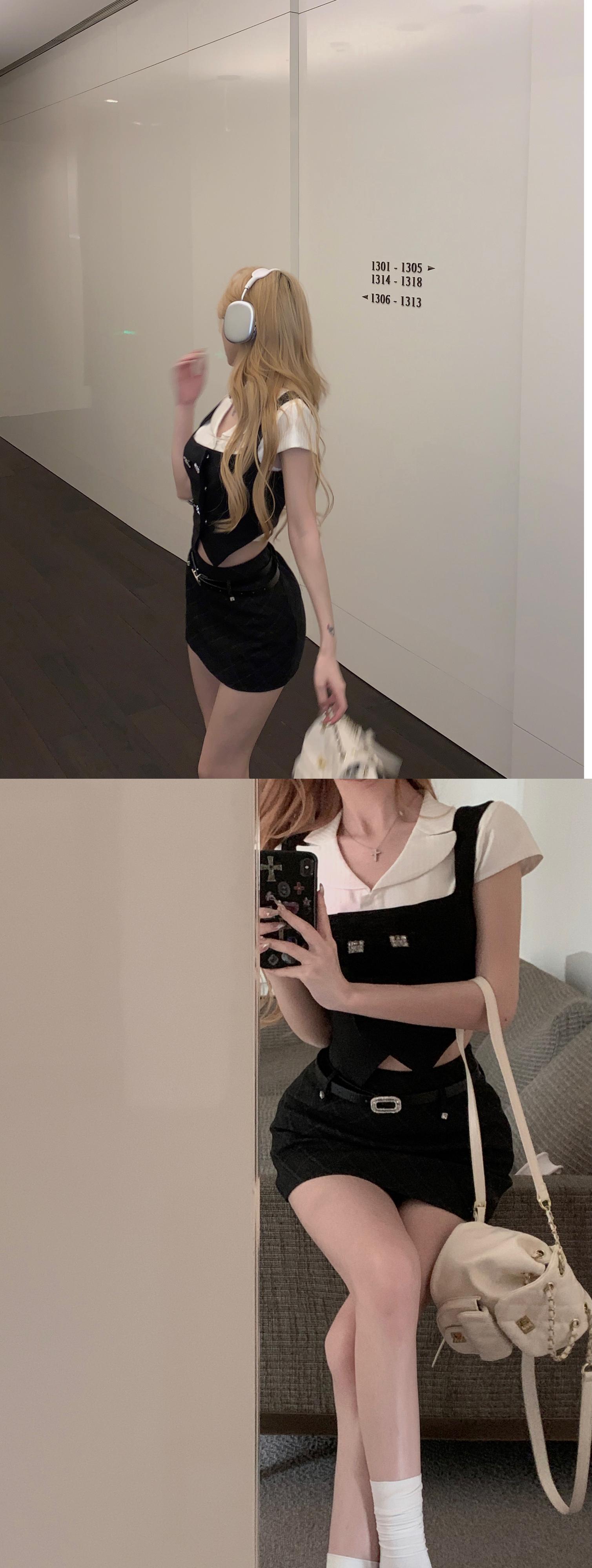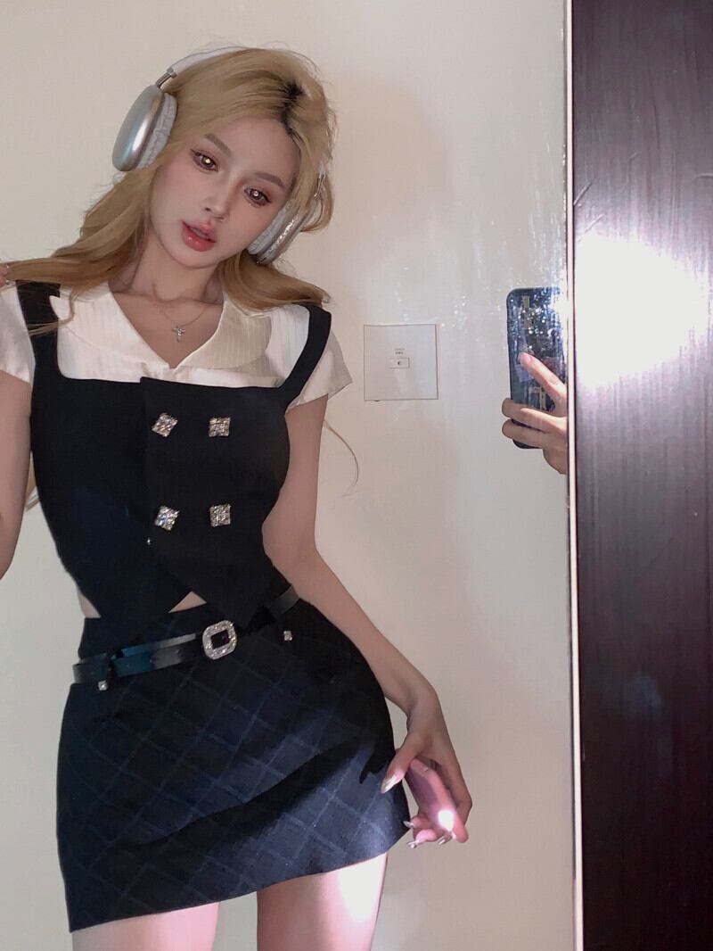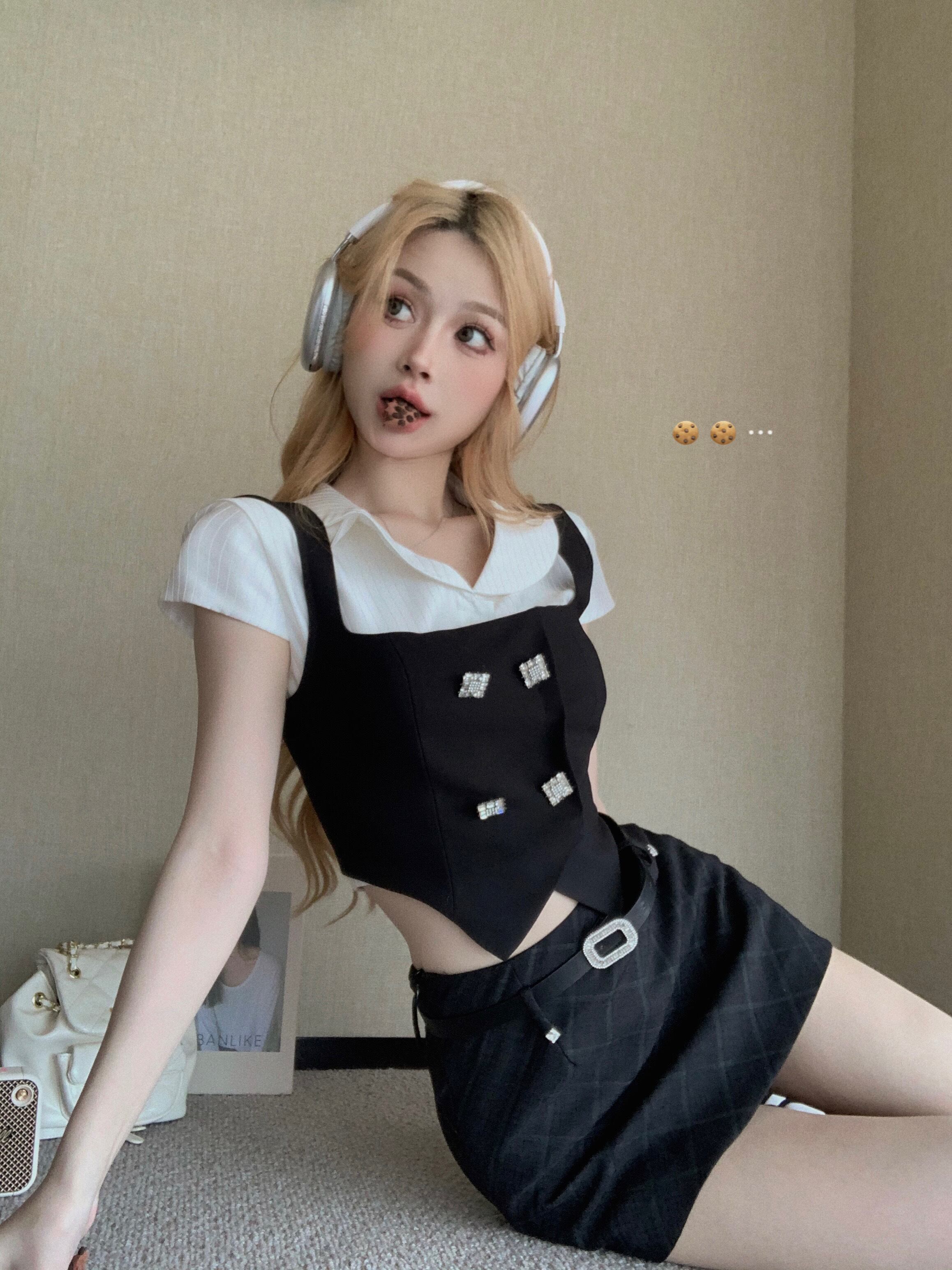 ホットガール プレッピー スタイル スーツ レディース 半袖 ターンダウン カラー シャツ ストラップレス ベスト ウエスト A ライン スカート 3 点セット Aライン