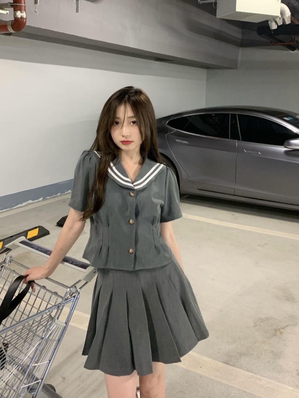 夏プレッピースタイル JK スーツコントラストセーラー襟バブルスリーブシャツプリーツミニスカート 2 点セット服 サマー 夏物