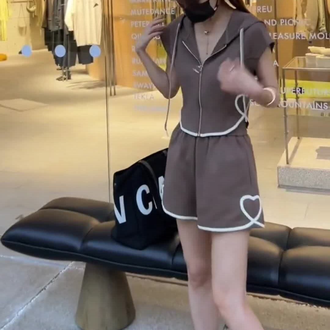 甘いホットガールスポーツスーツ夏ハートフード付き半袖トップウエストショーツ 2 点セット服 大人ガーリー スウィート キュート カジュアル サマー 夏物 ブルマー