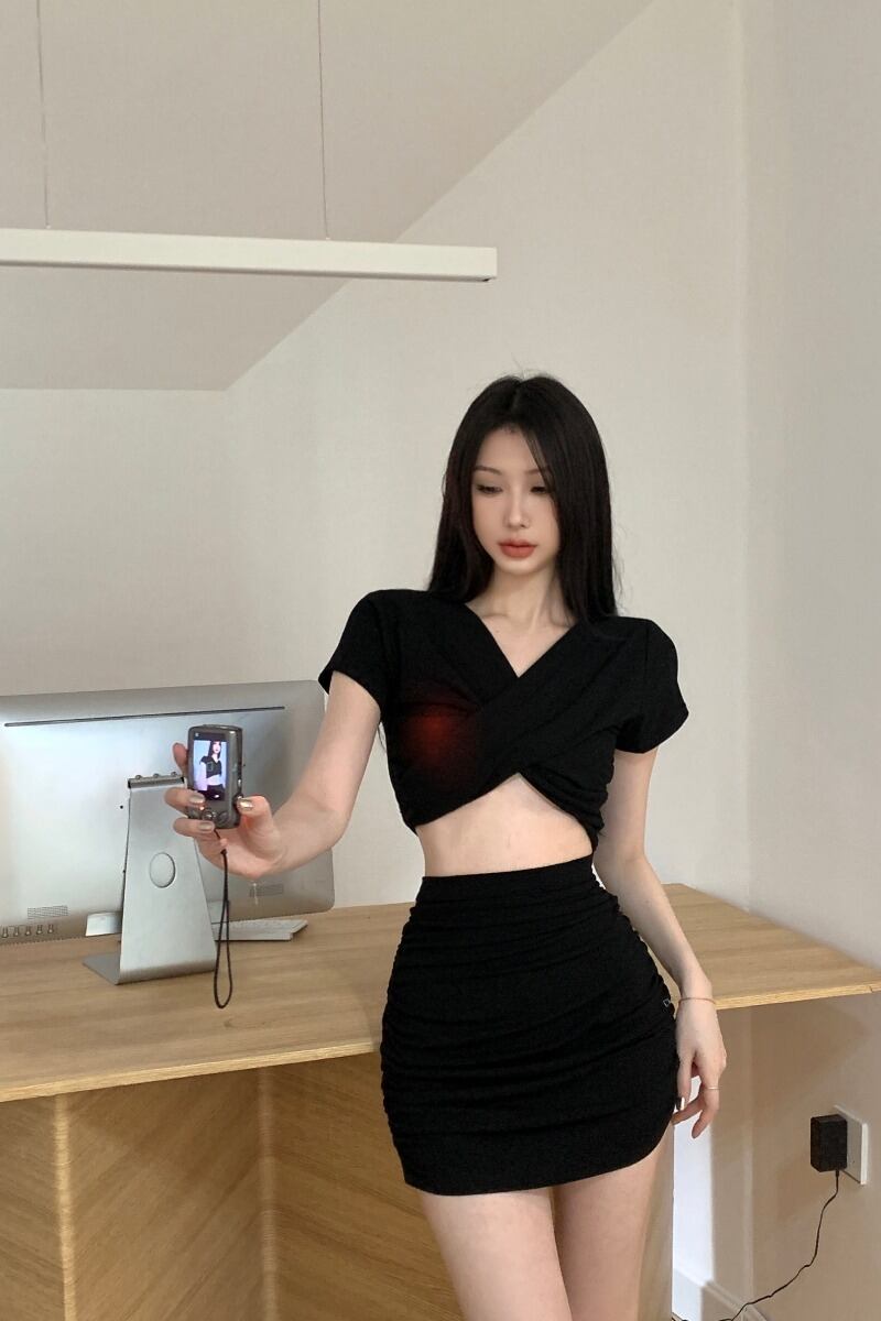 ホットガールスーツ半袖 V ネックトップ夏ウエストプリーツラップヒップミニスカート黒 2 点セット服 ブラック サマー 夏物 Vネック