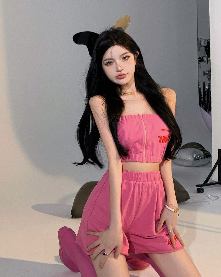 香港スタイルホットガールズスーツ夏ピンクストラップレストップスポーツワイドレッグショーツ 2 点セット服 サマー 夏物 ブルマー ワイドパンツ