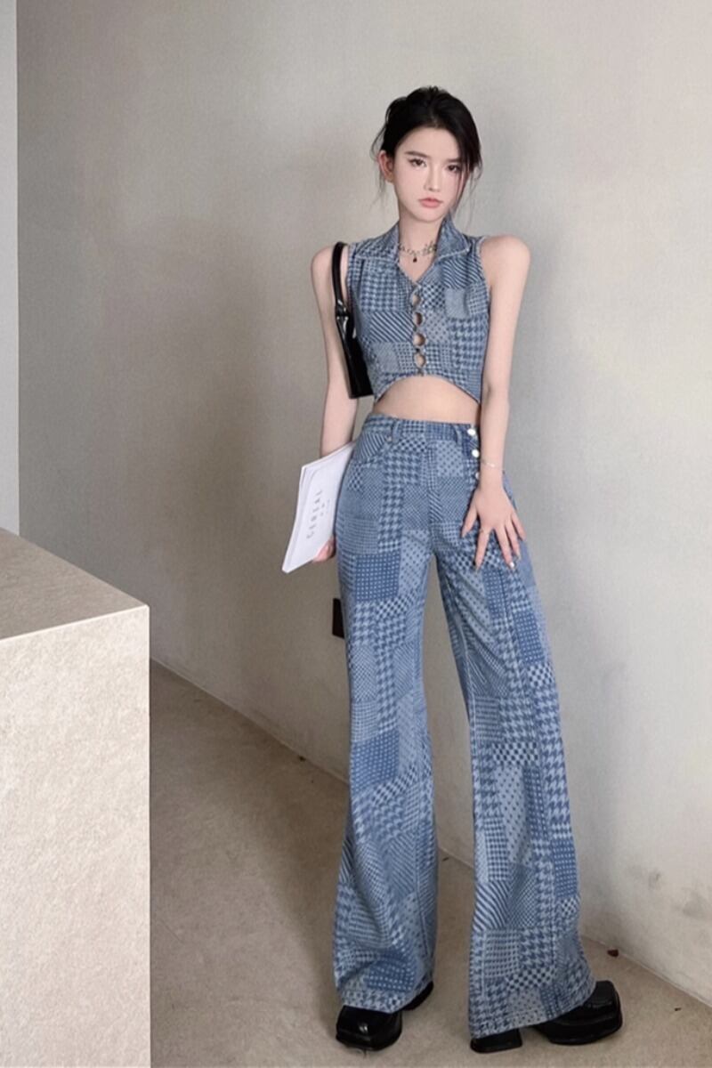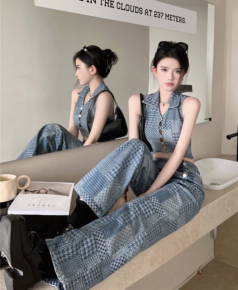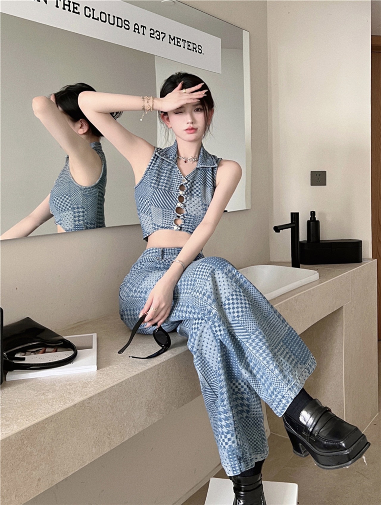 夏レトロセクシーホットガールスーツデニムノースリーブタンクトップウエストワイドレッグパンツツーピースセット服 サマー 夏物 ワイドパンツ