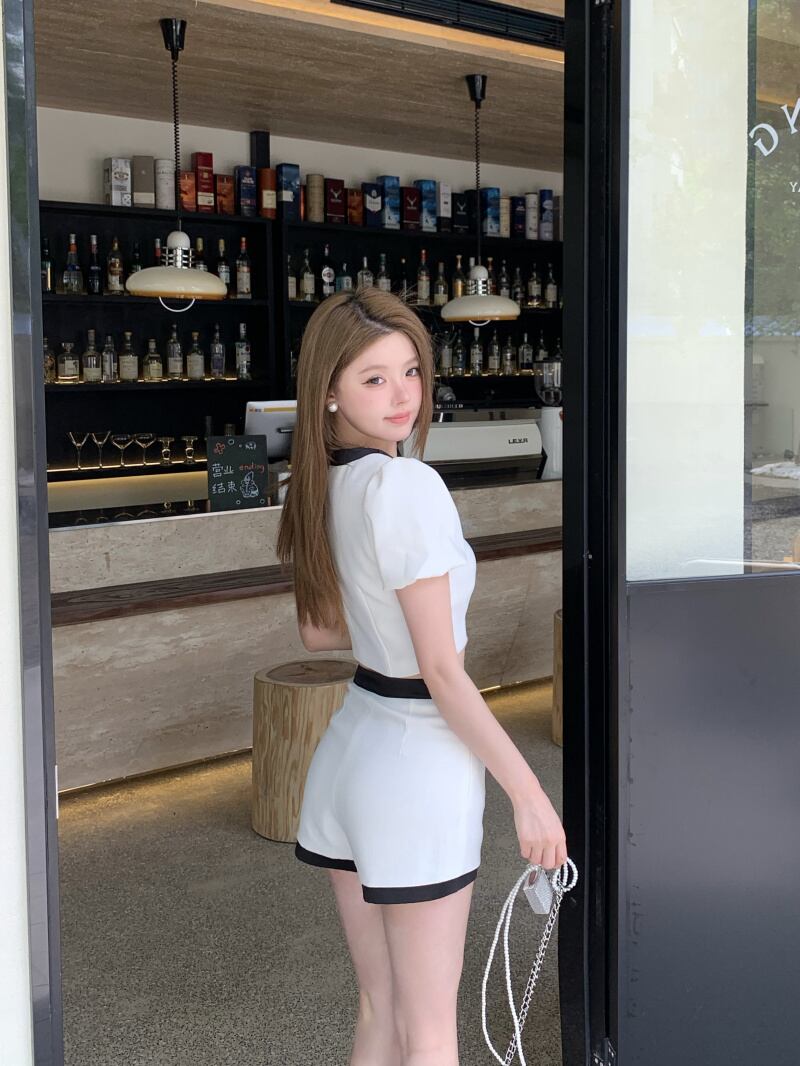ホットガールスーツ夏半袖ラウンドネックシャツトップウエストショーツツーピースセット服 サマー 夏物 ブルマー Oネック