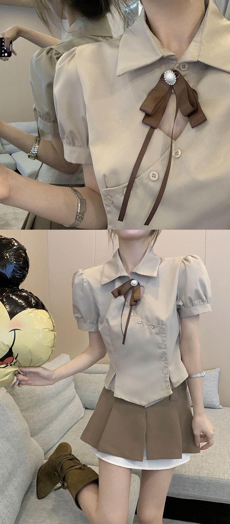 ホットガールズスタイルスーツ中空ハート半袖シャツウエスト A ラインプリーツミニスカート 2 点セット服 Aライン