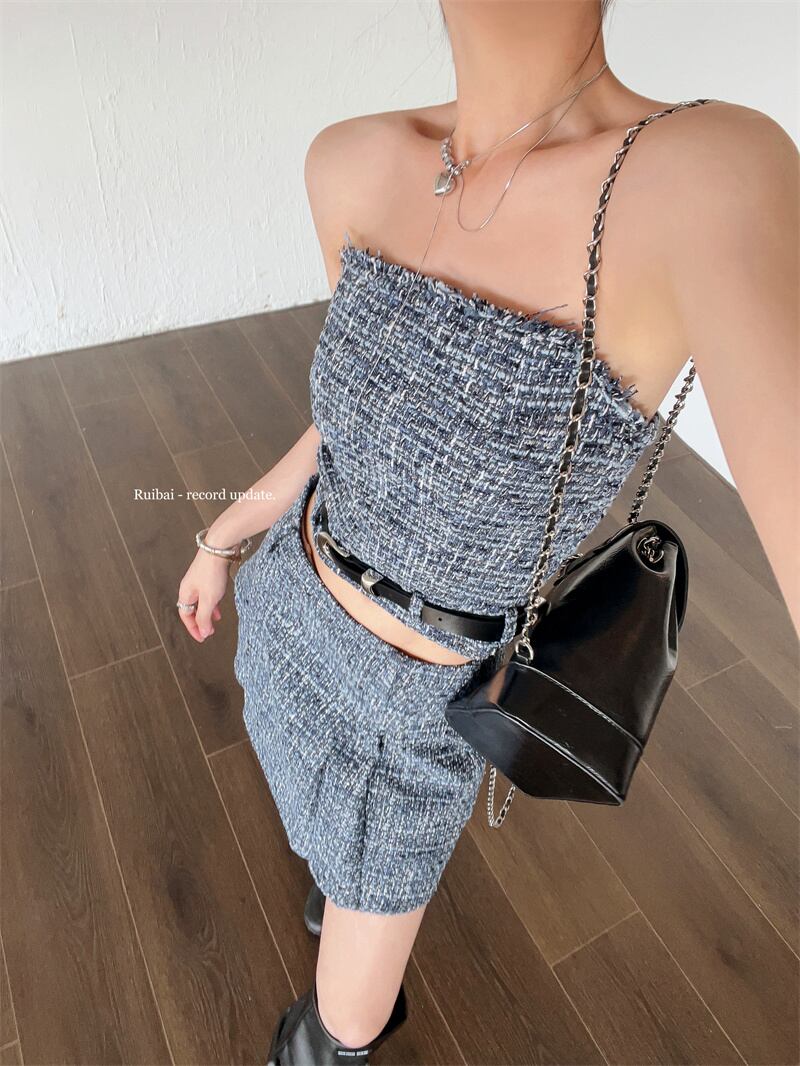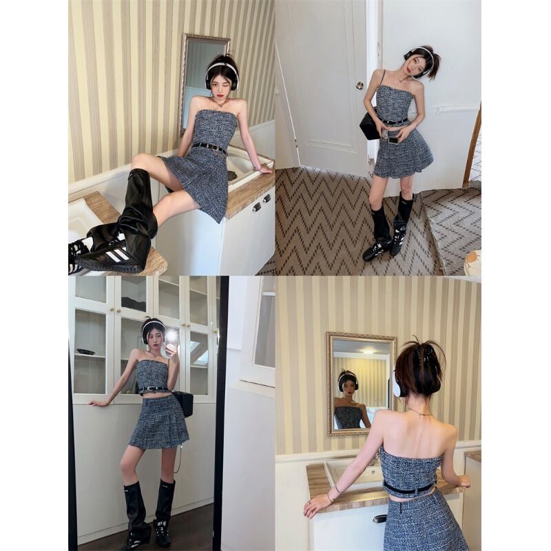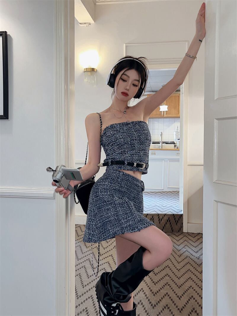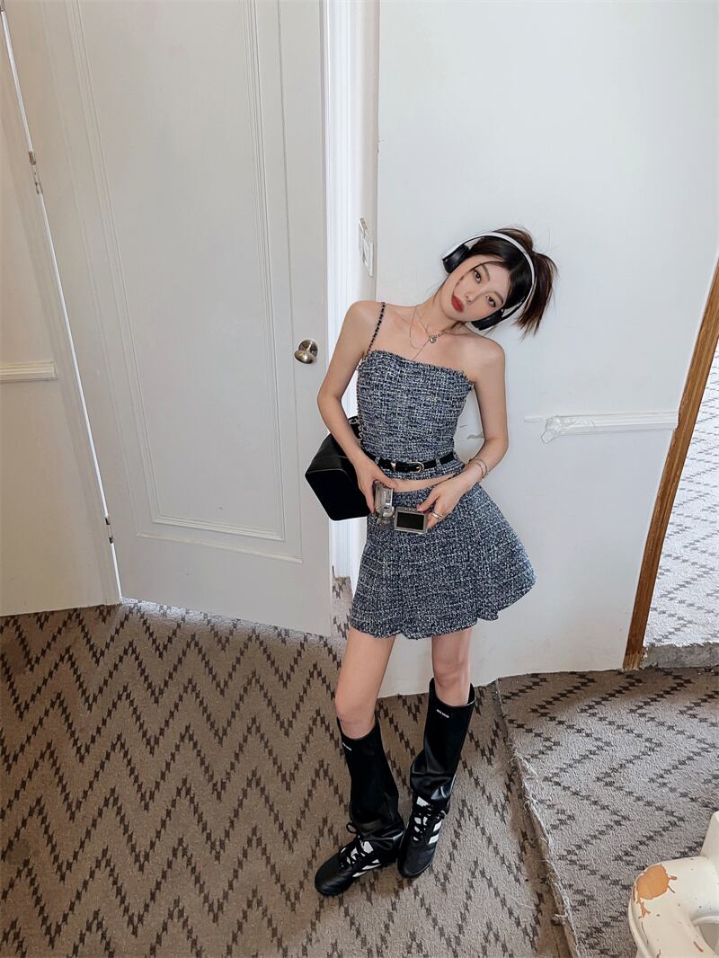 ホットガールセクシースリムフィットスーツストラップレスタンクトップウエスト A ラインミニスカート夏ツーピースセット服 サマー 夏物 Aライン