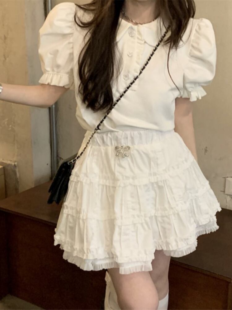 Gothiscyn ホワイトスーツカップケーキスカートネック Tシャツパフスリーブショートスカートツーピースサマースーツシック 夏物