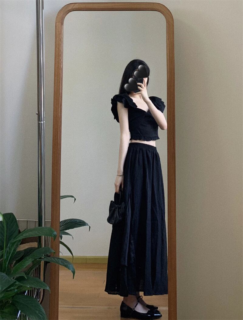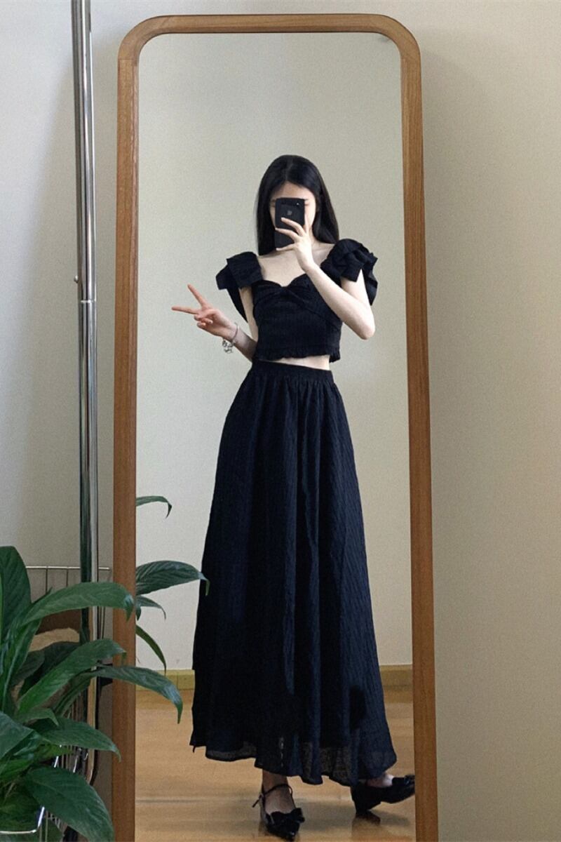 フランスオフィスレディスーツ夏フライングスリーブショートトップウエストAラインロングスカート2点セット服 サマー 夏物 会社 学校 通勤や通学にも