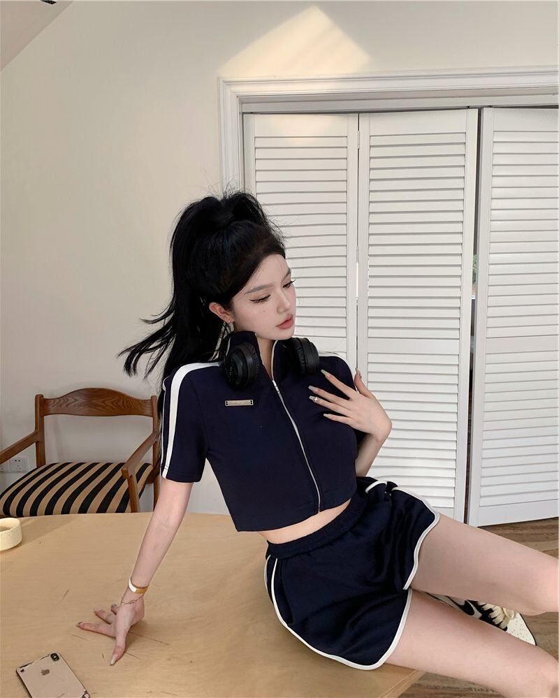 ホットガール ホワイト スポーツ スーツ レディース 夏 スタンドカラー スリム フィット 半袖 トップ ウエスト ショーツ 2 点セット サマー 夏物 ブルマー