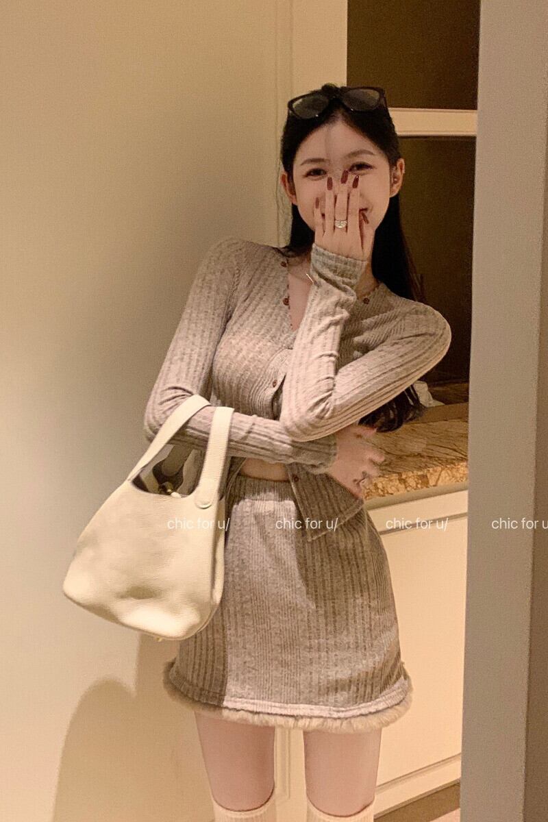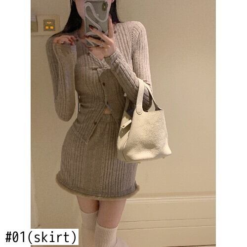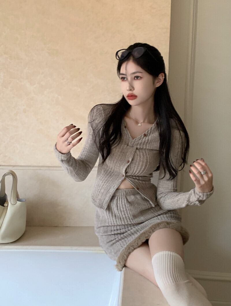 ホットガールスーツ長袖 V ネックニットカーディガンショートトップウエストファーヒールラップスカート服 ロング Vネック