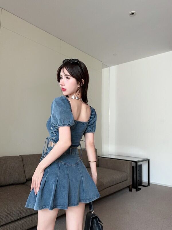 夏ホットガールスーツ半袖スクエアカラートップウエストプリーツデニムミニスカートツーピースセット服 ショート ハーフスリーブ サマー 夏物 スクウェア