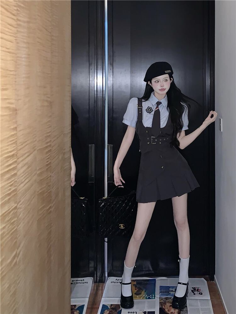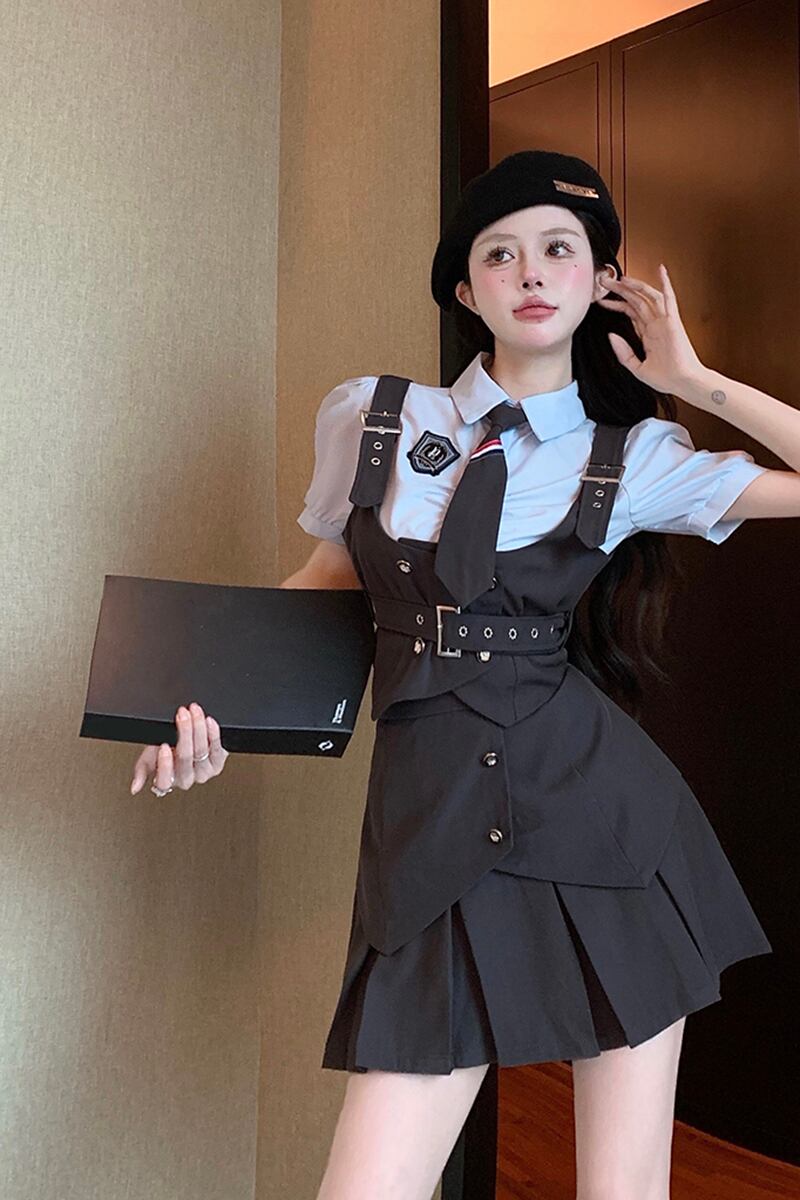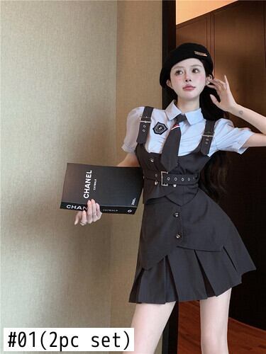ホットガールズスタイルレトロスーツサマーシャツトップウエストプリーツミニスカートツーピースセット服 夏物