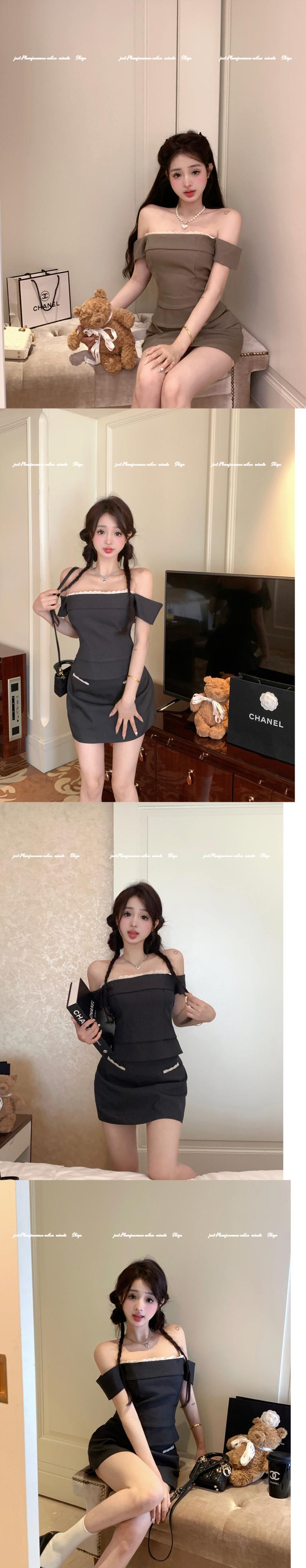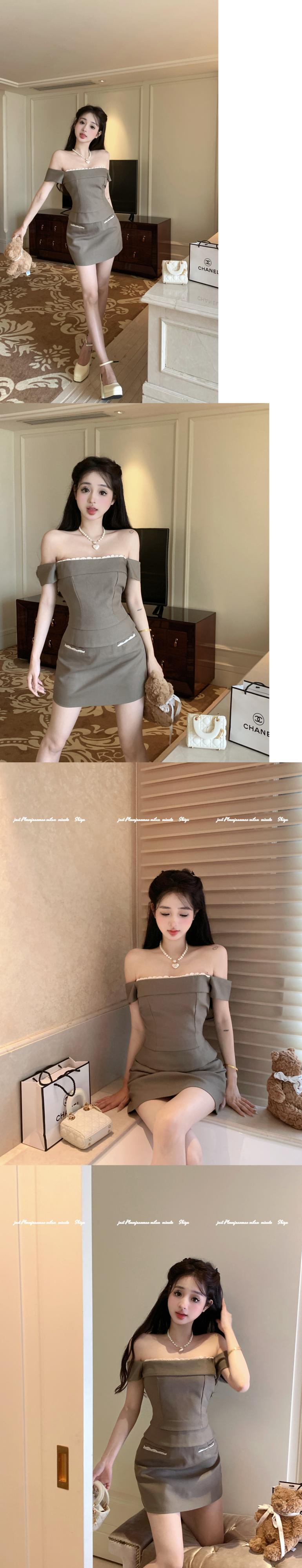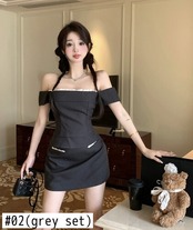 ホットガールセクシースーツレースオフショルダーストラップレストップサマーラップヒップショートスカートグレーツーピースセット服 夏物