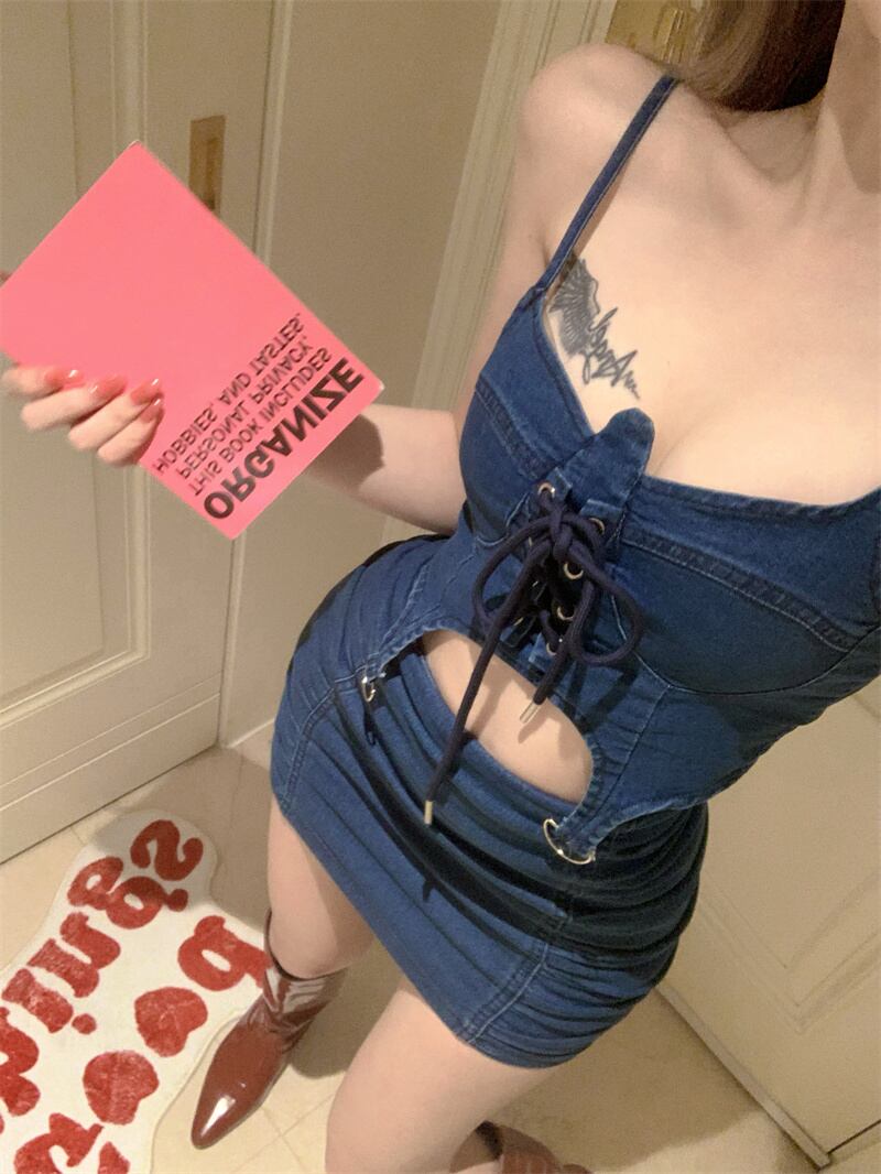 香港スタイルレトロスーツ夏セクシーホットガールストラップデニムトップラップヒップスカートツーピースセット服 サマー 夏物
