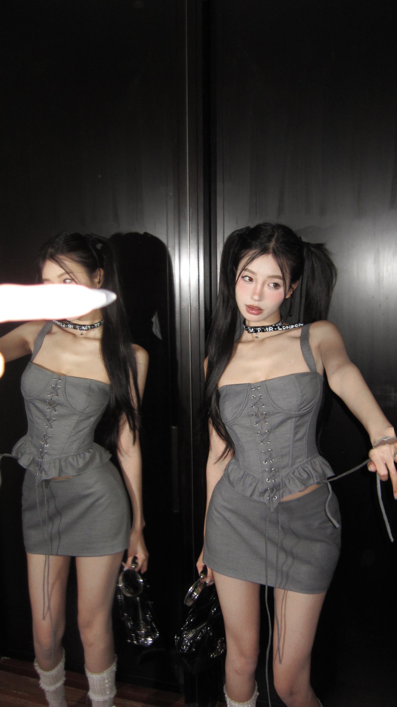 フレンチレトロスタイルスーツ不規則ストラップタンクショートトップウエストミニスカート夏ツーピースセット服 サマー 夏物