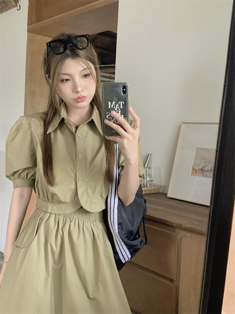 フレンチスーツ レディース バブルスリーブシャツ ショートトップ ルーズウエスト ミドル丈スカート 2点セット服