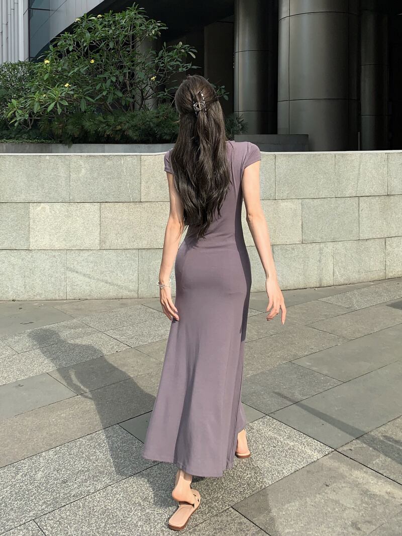 グレースクエアカラー半袖ドレス夏タイト純粋セクシースタイルスリムフィット A ラインラップヒップロングドレス服 サマー 夏物 Aライン ピュア スクウェア