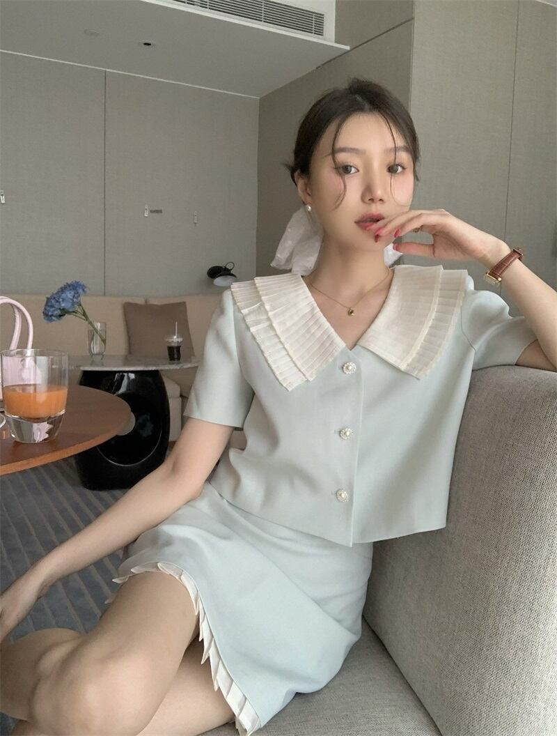 Sweet Girl スーツ レディース 夏半袖シャツ トップ ウエストパネル ミニスカート ブルー 2 点セット服 大人ガーリー スウィート キュート カジュアル サマー 夏物
