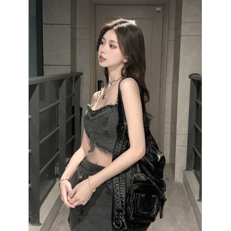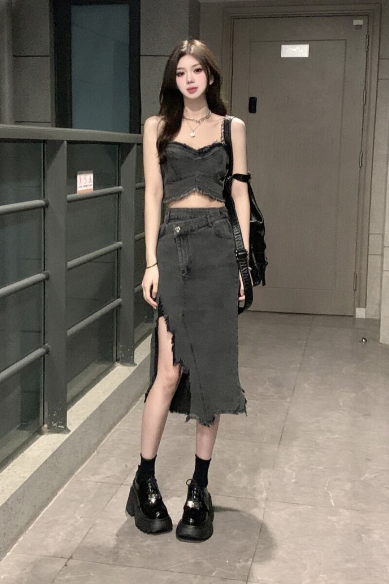 スイートクールホットガールデニムスーツ夏ストラップスクエアカラートップスプリットロングスカートツーピースセット服 大人ガーリー スウィート キュート カジュアル サマー 夏物 スクウェア