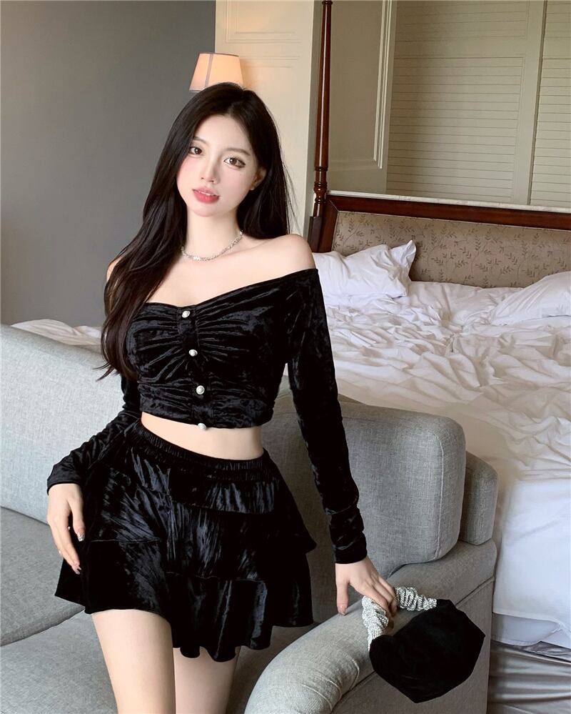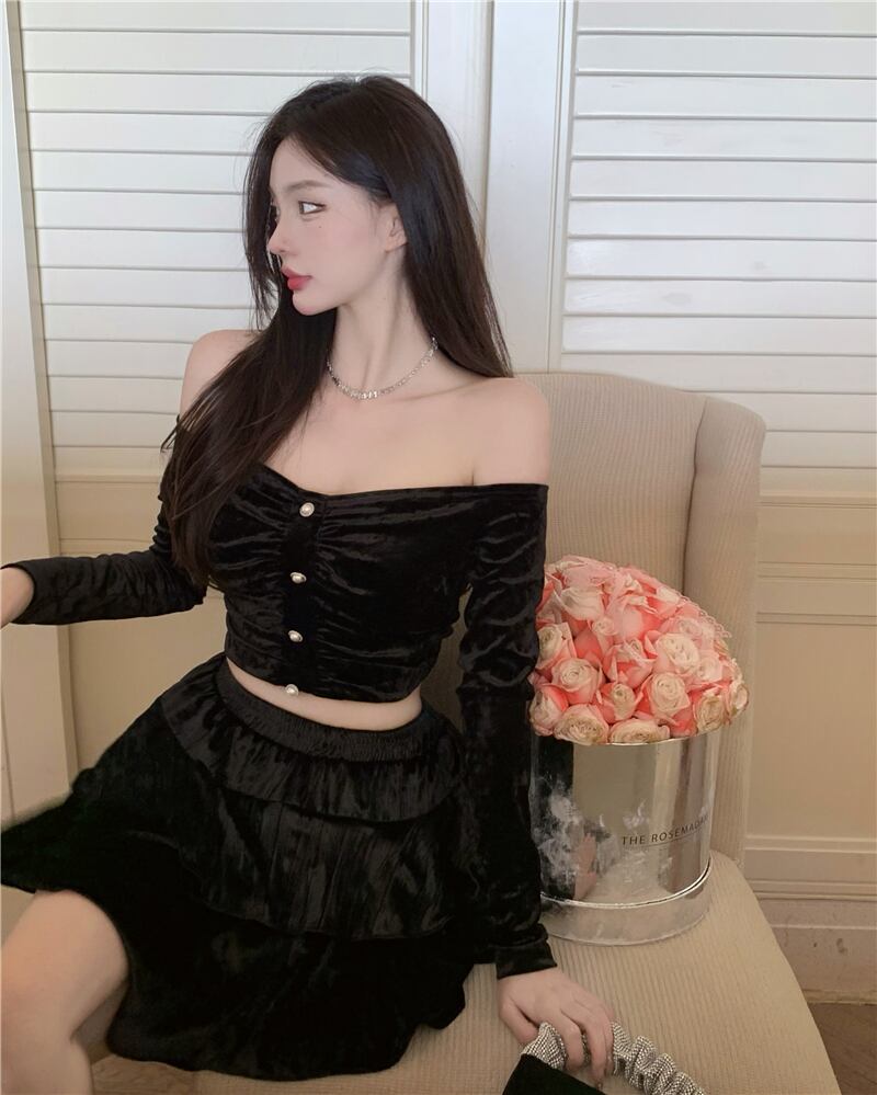 ホットガールスーツ純粋セクシーオフショルダー長袖ショートトップ多用途フリルレイヤードスカートツーピースセット服 ロング レッド ピュア