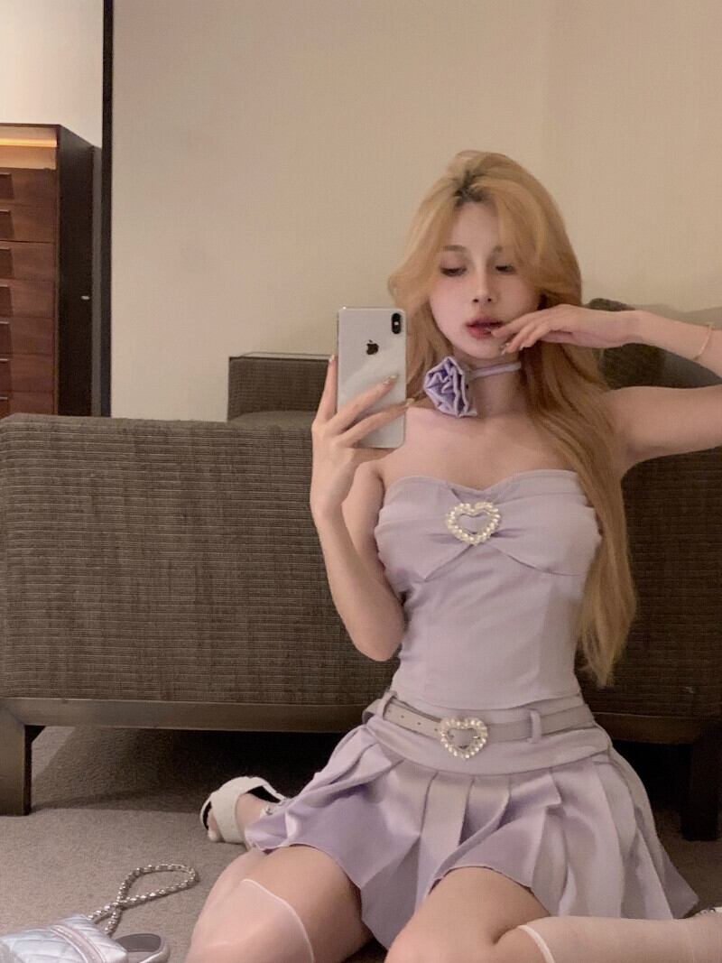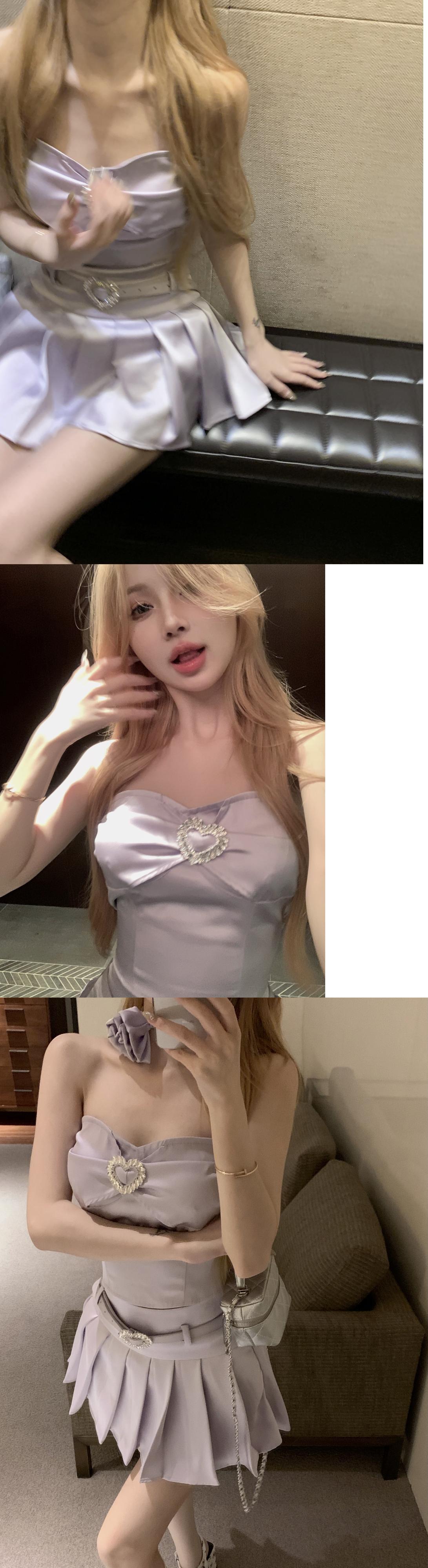 セクシーホットガールパープルスーツ夏ストラップレスベストショートトップウエストプリーツミニスカートツーピースセット服 サマー 夏物