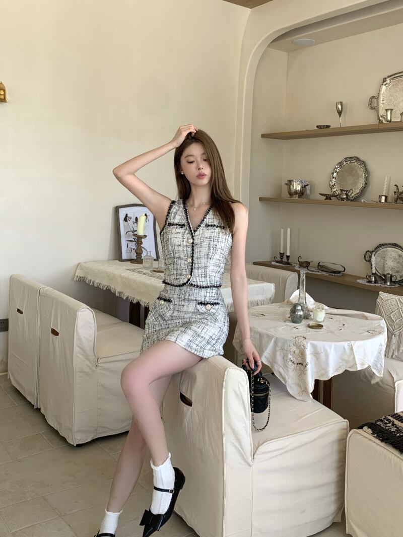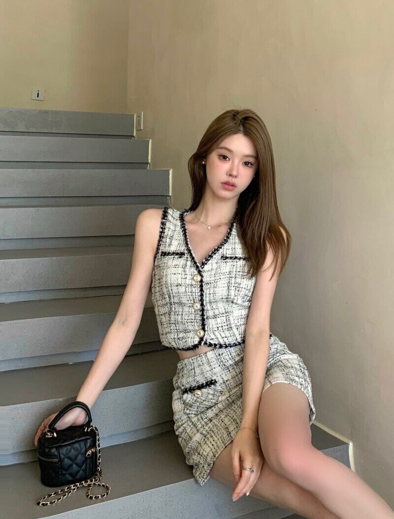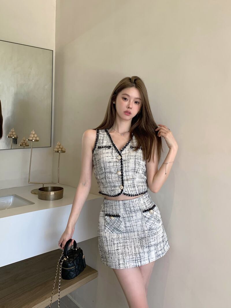 スタイルホットガールスーツ夏ノースリーブ V ネックベストトップウエストミニスカート 2 点セット服 サマー 夏物 Vネック