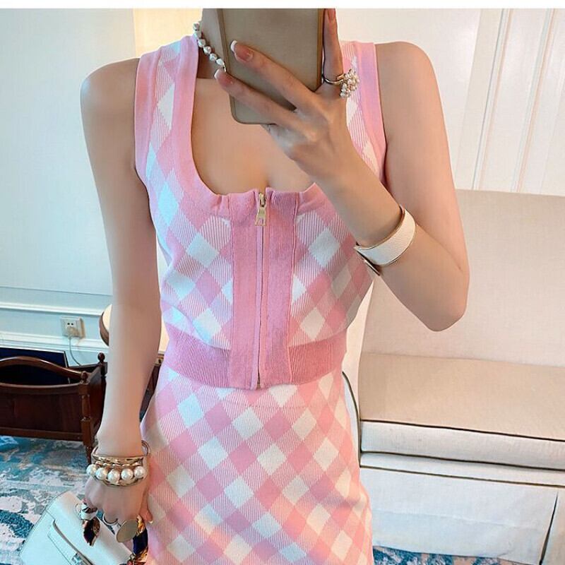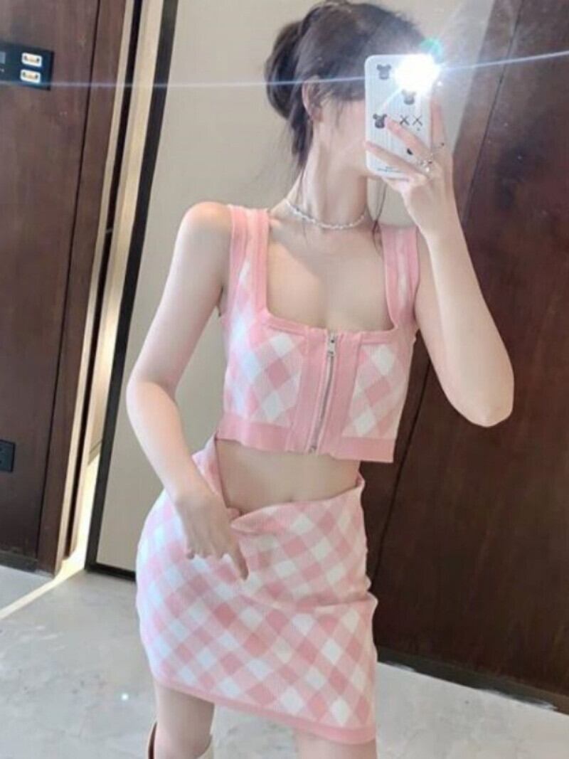 甘いホットガールスーツ夏サスペンダースクエアカラージッパーショートチェック柄ベストウエストスカート 2 点セット 大人ガーリー スウィート キュート カジュアル サマー 夏物 スクウェア