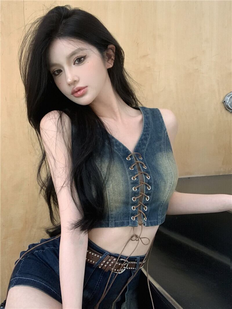 フランスホットガールズセクシーデニムスーツ夏レースアップストラップレストップウエストデニムラップヒップショーツ 2 点セット サマー 夏物 ブルマー