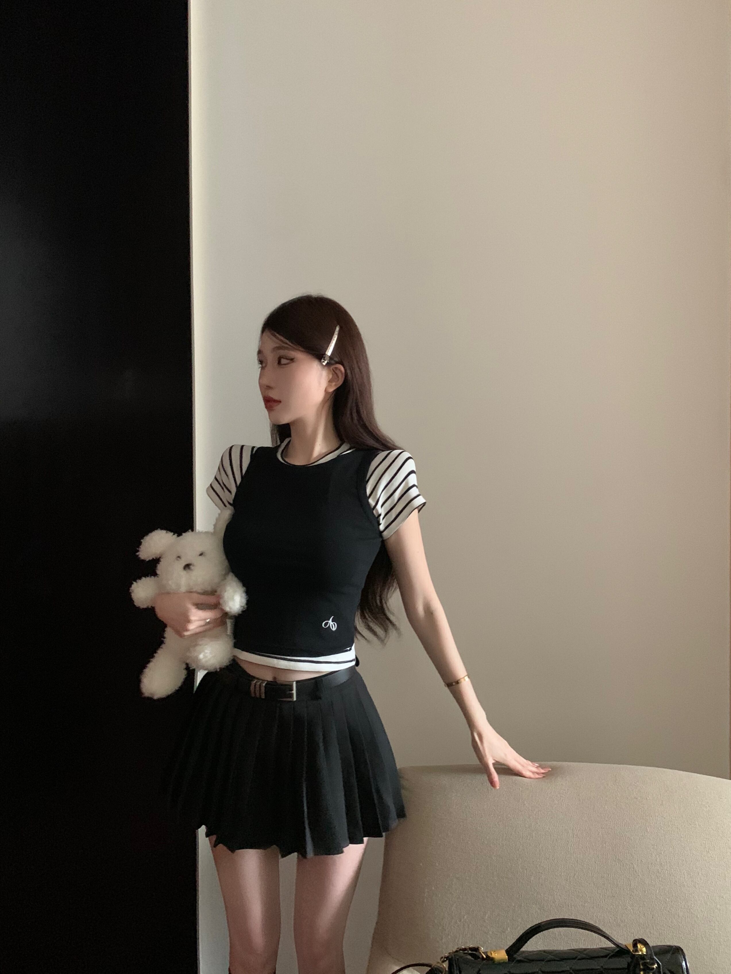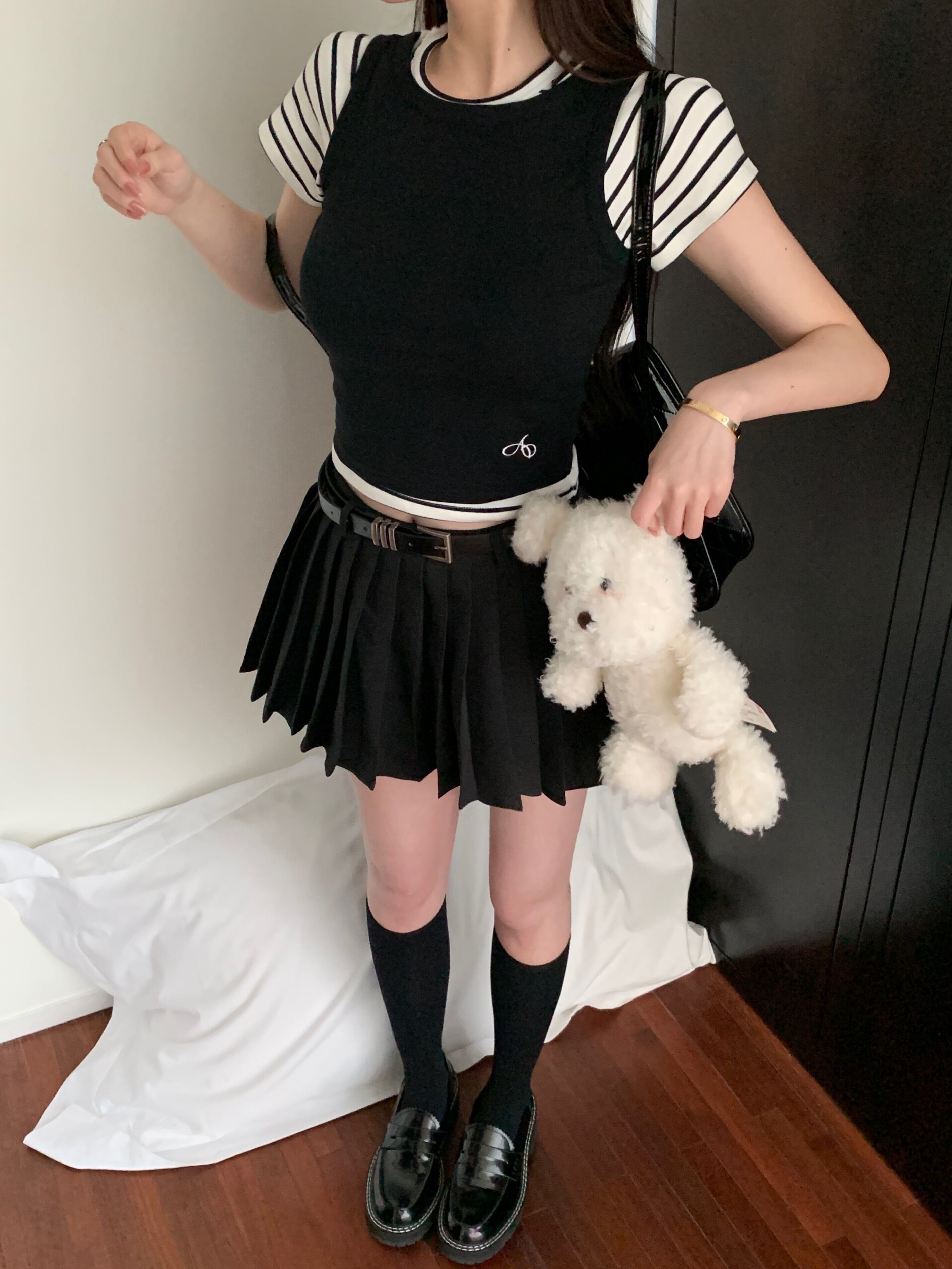 プレッピー スタイル スーツ レディース ストライプ Tシャツ ブラック タンクトップ スリム フィット ミニ スカート スイート クール ホット ガールズ 3 点セット 大人ガーリー スウィート キュート カジュアル
