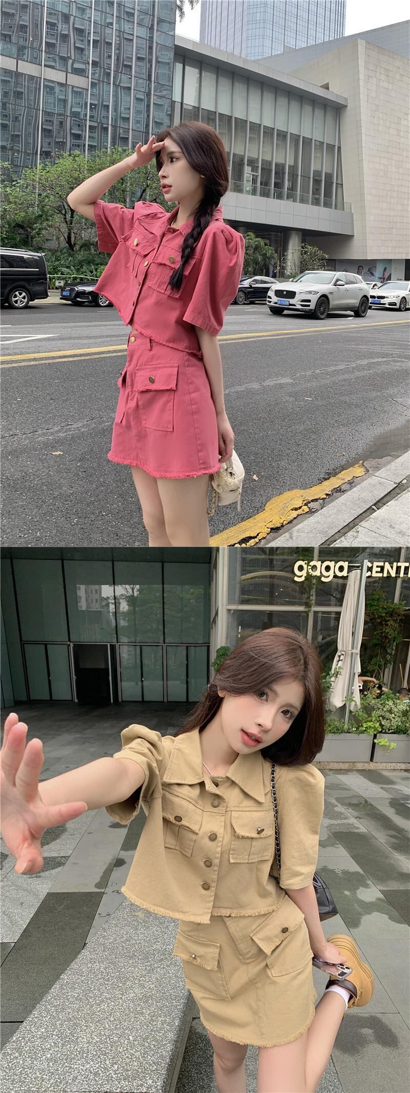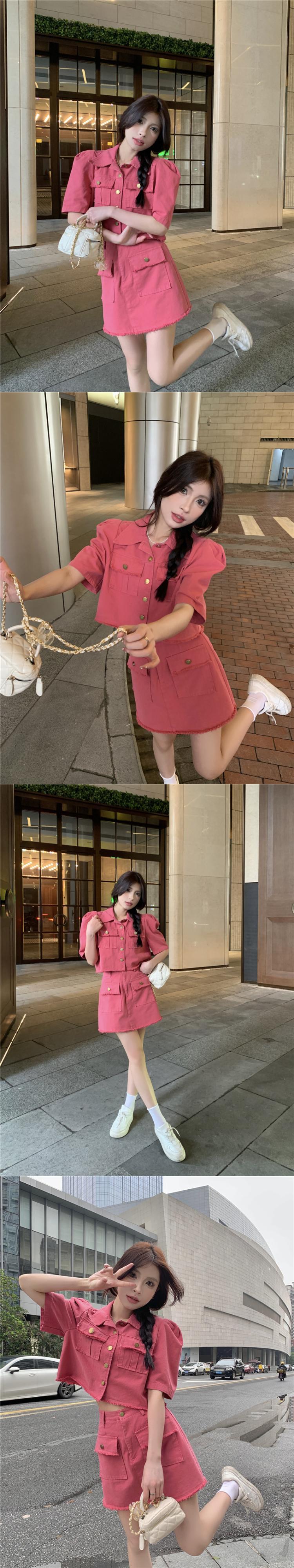 ピンク甘いデニムスーツ夏ターンダウン襟半袖コート A ラインミニスカート 2 点セット服 大人ガーリー スウィート キュート カジュアル サマー 夏物 Aライン