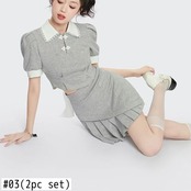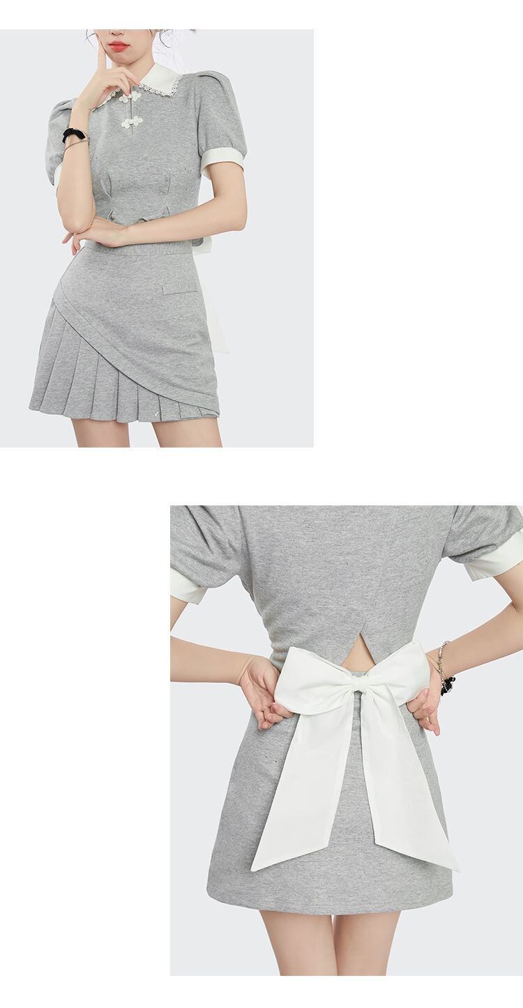 中国風サマースーツ レディース ターンダウンカラー ショートニットトップ ウエスト非対称プリーツミニスカート 2点セット 夏物