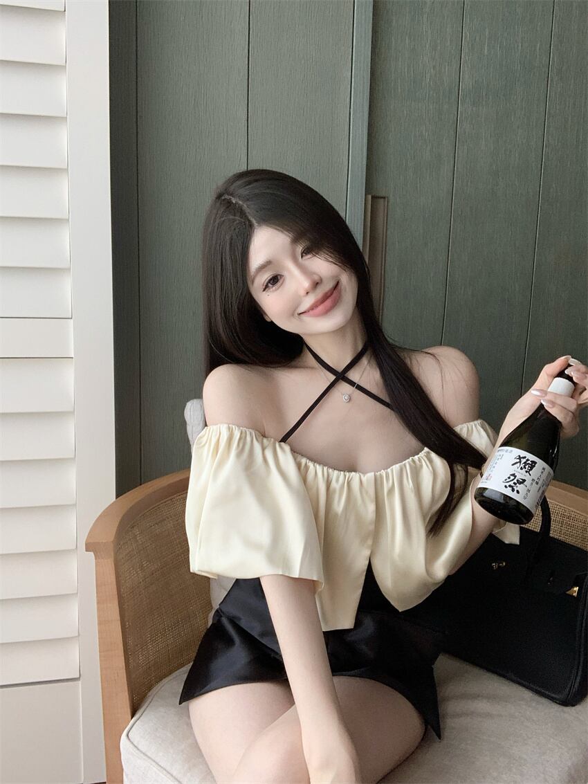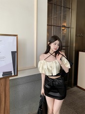 甘くてホットガールズスーツ レディース サテンスラッシュネック ノースリーブ ホルタートップ ボウタイ ピュアセクシー ヒップラップ ミニスカート 2点セット リボン 大人ガーリー スウィート キュート カジュアル