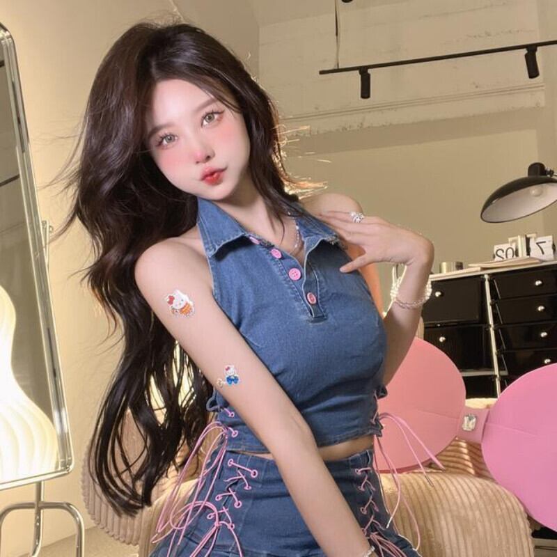 香港甘いホットガールスーツストラップデニムターンダウン襟ベストプリーツミニスカートツーピースセット服 大人ガーリー スウィート キュート カジュアル