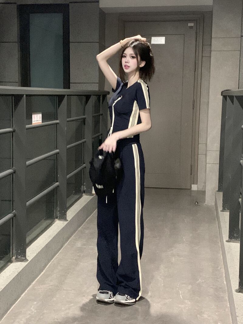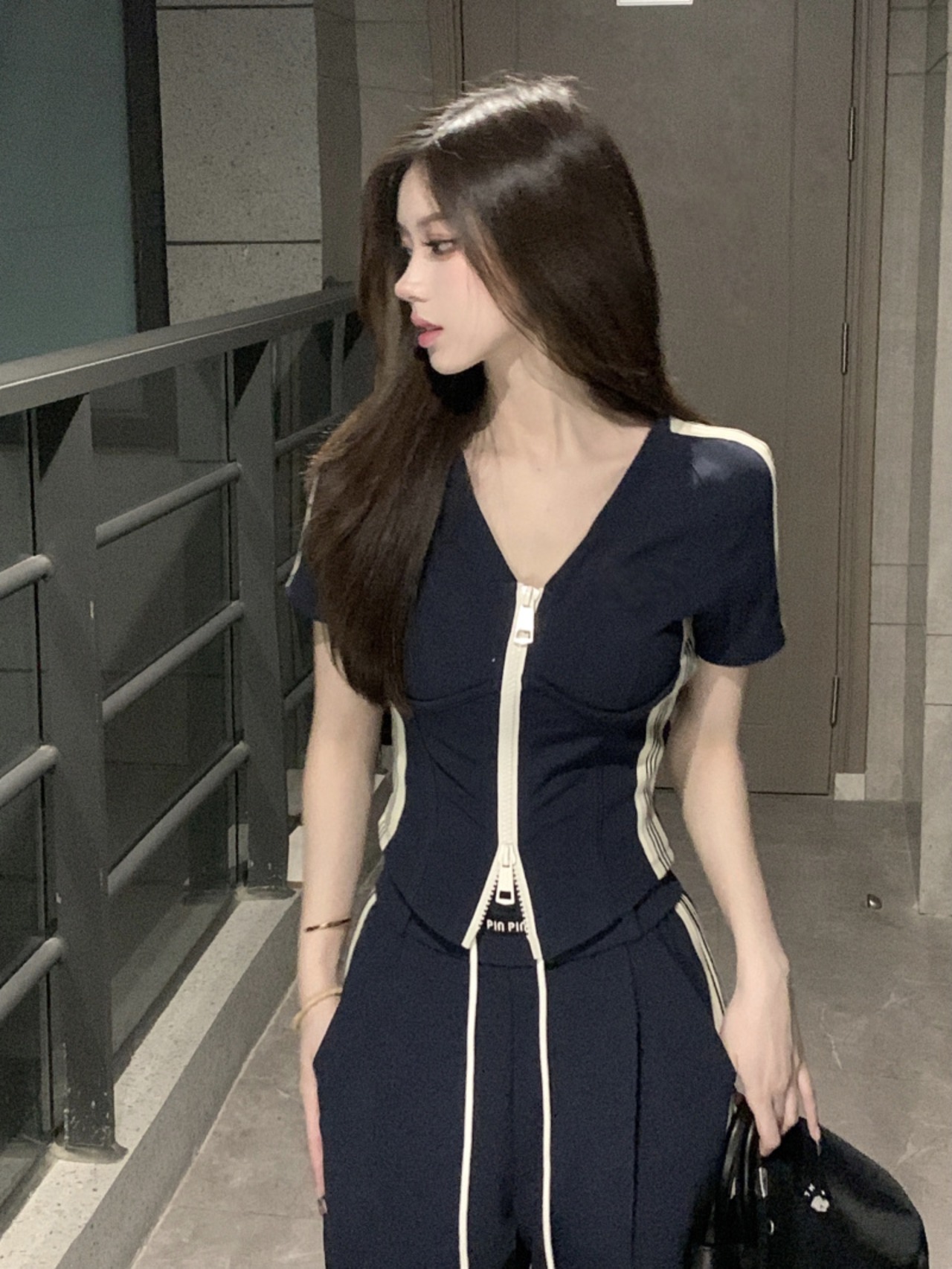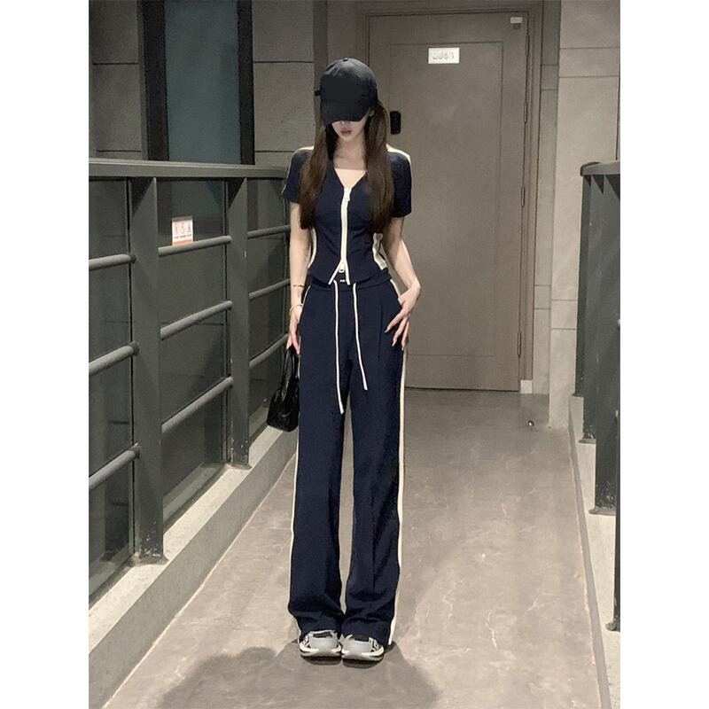 ホットガールスポーツスーツジッパー半袖カーディガン巾着ウエストストレートパンツ 2 点セット