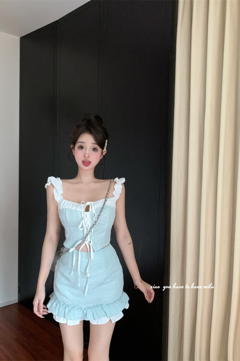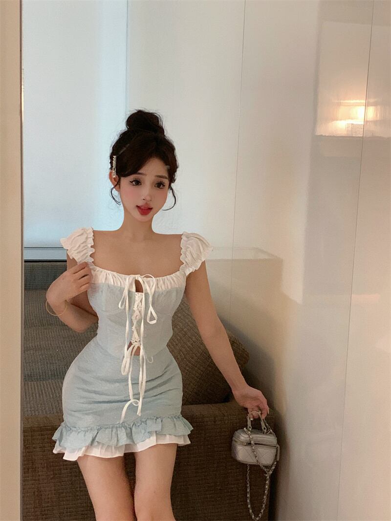 スイートガールスーツ夏コントラストスクエアカラーショートレースアップトップラップヒップミニスカートツーピースセット服 大人ガーリー スウィート キュート カジュアル サマー 夏物 スクウェア