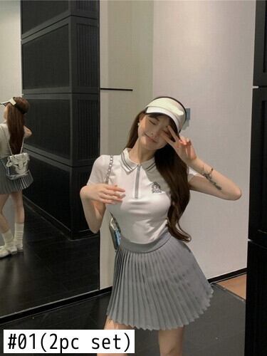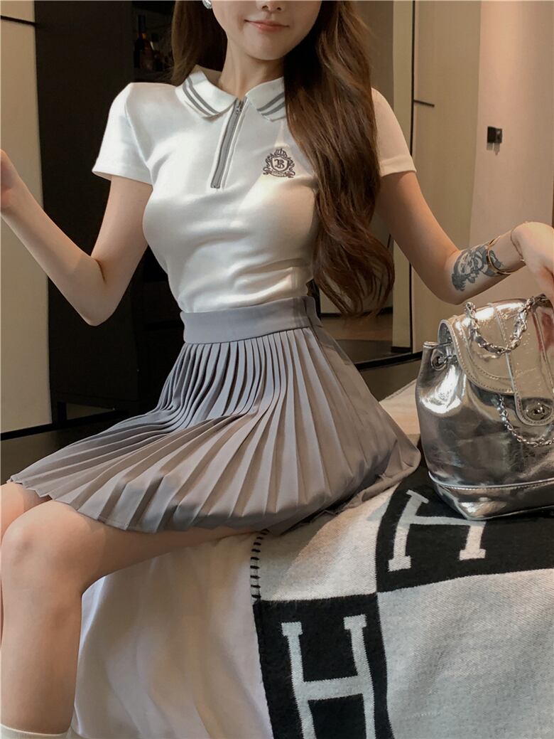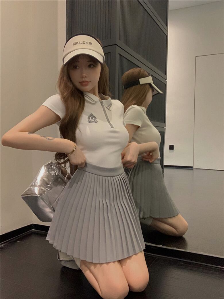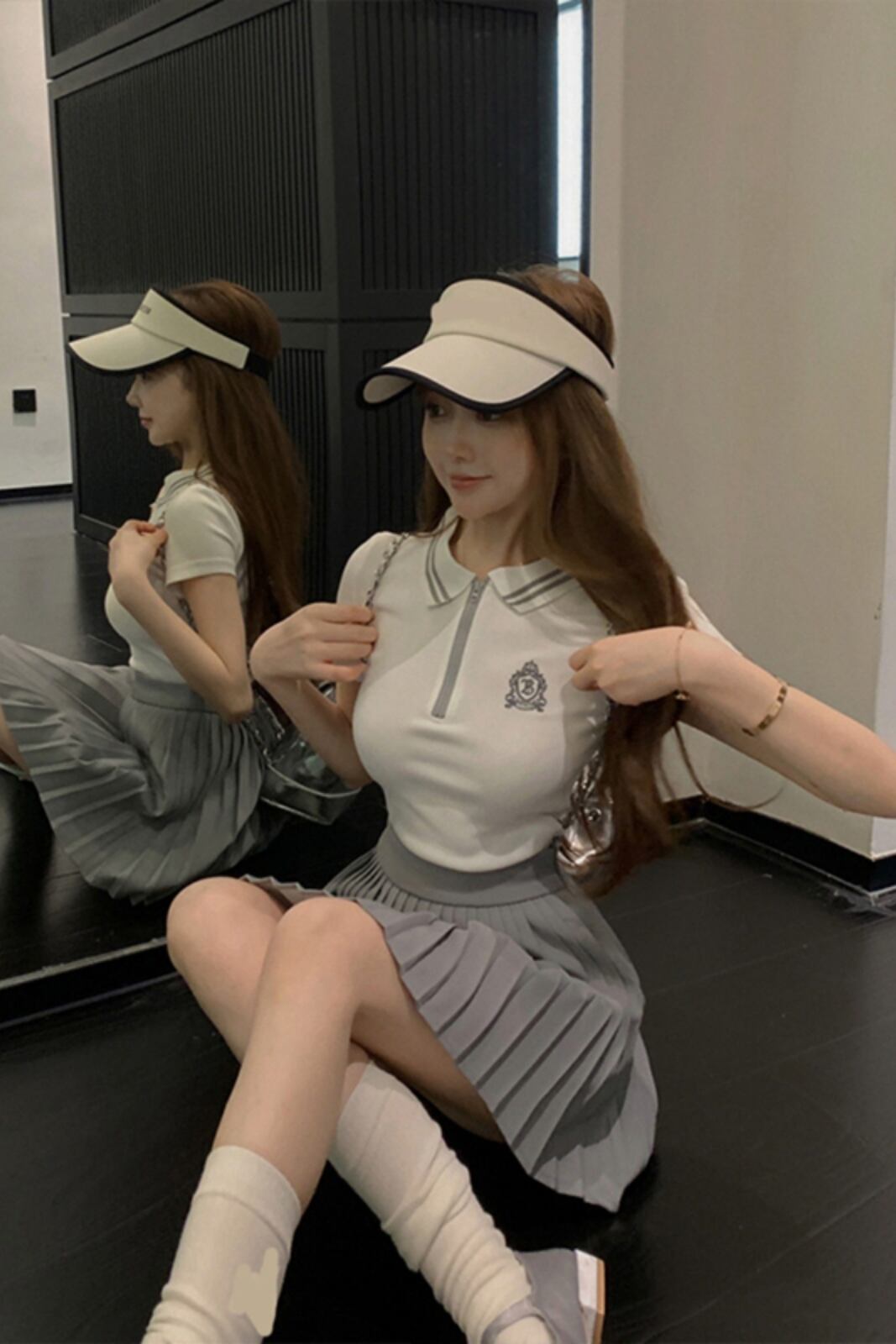 レトロセクシースポーツスーツ夏コントラストターンダウン襟 Tシャツプリーツウエストスカートショーツ 2 点セット サマー 夏物 ブルマー