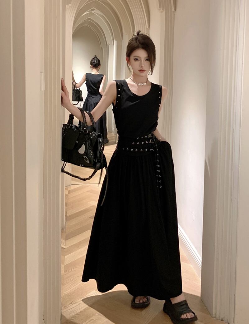 甘いホットガールセクシーノースリーブ黒ドレス夏 O ネックリベットスリムフィット A ラインロングドレス服 ブラック 大人ガーリー スウィート キュート カジュアル サマー 夏物 Oネック Aライン