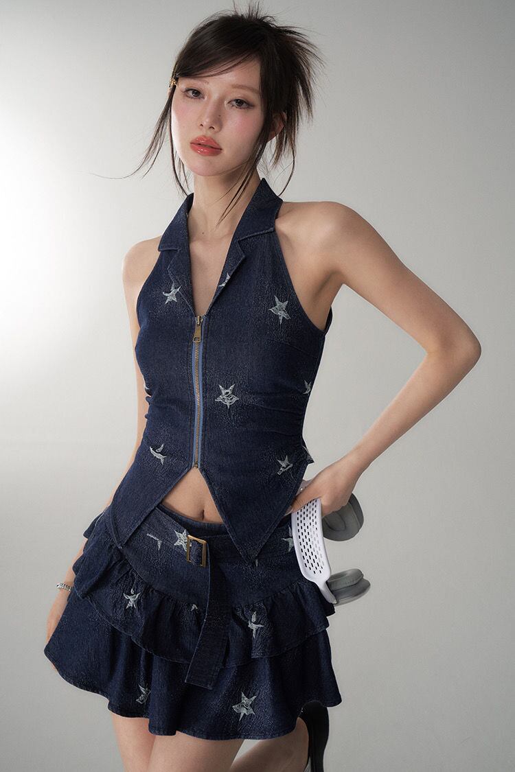 甘くてホット女子セクシースーツ夏デニムホルターネックトップウエストケーキスカートツーピースセット服 大人ガーリー スウィート キュート カジュアル サマー 夏物