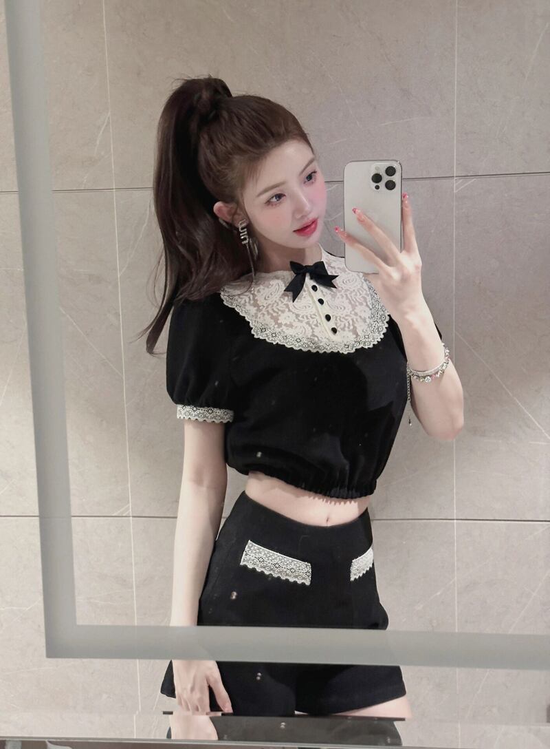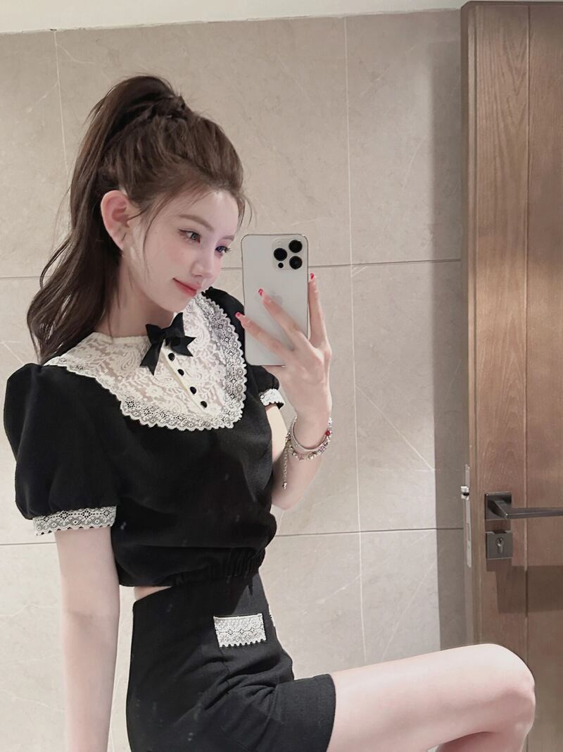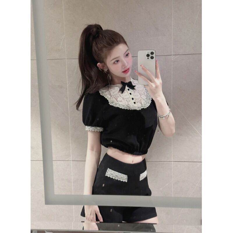 甘いホットガールズスーツ夏 O ネックレーススプライスパフスリーブボウブラウスショーツ 2 点セット服 リボン 大人ガーリー スウィート キュート カジュアル サマー 夏物 ブルマー Oネック