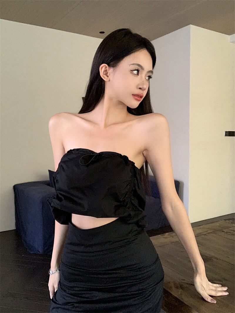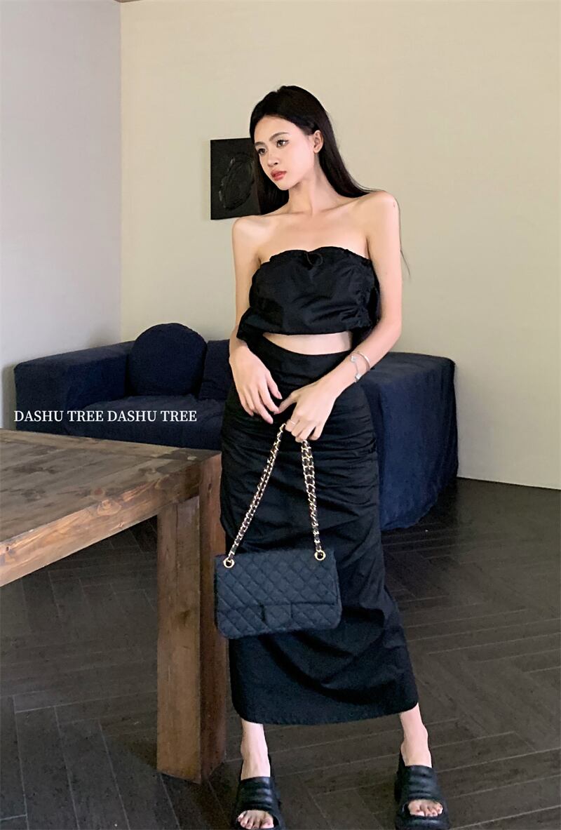 アメリカンホットガールズスーツプリーツストラップレスショートタンクトップウエストロングスカートツーピースセット服