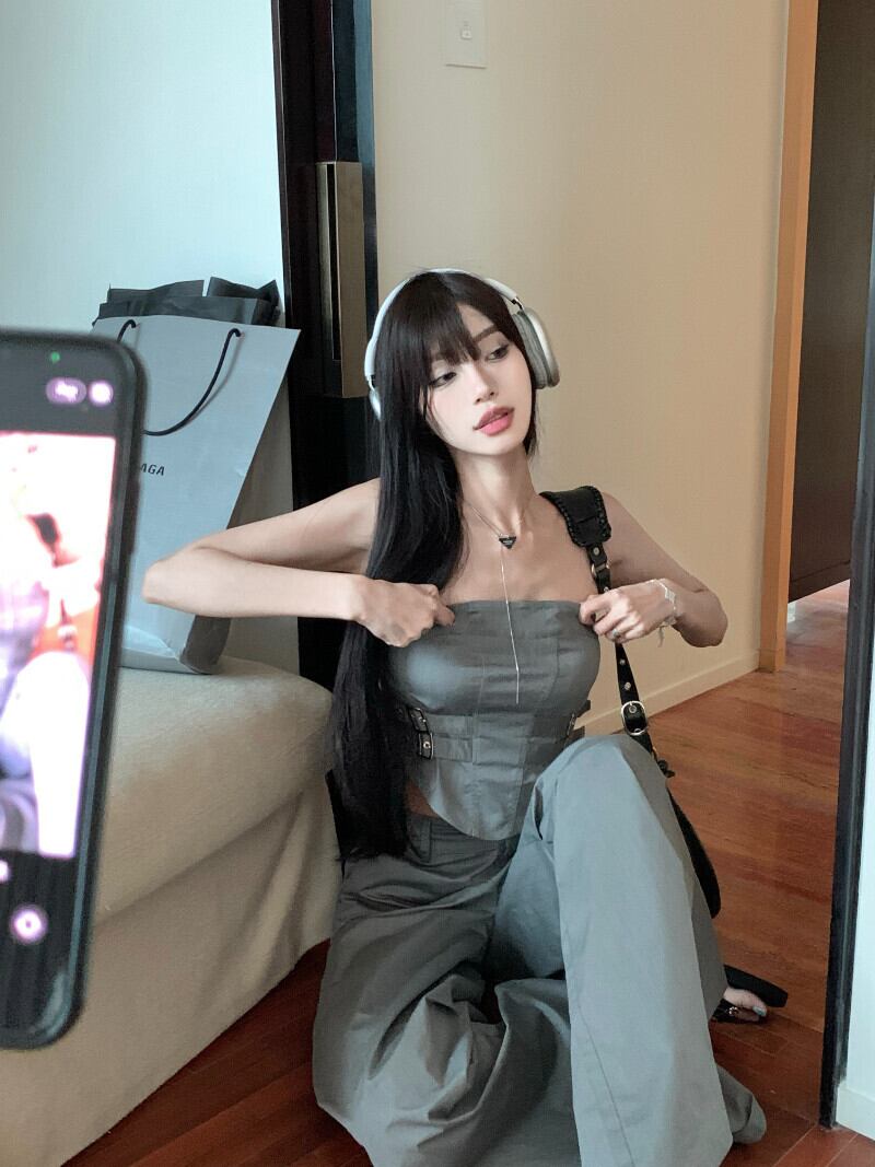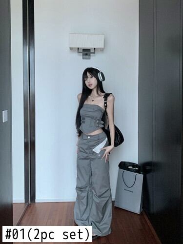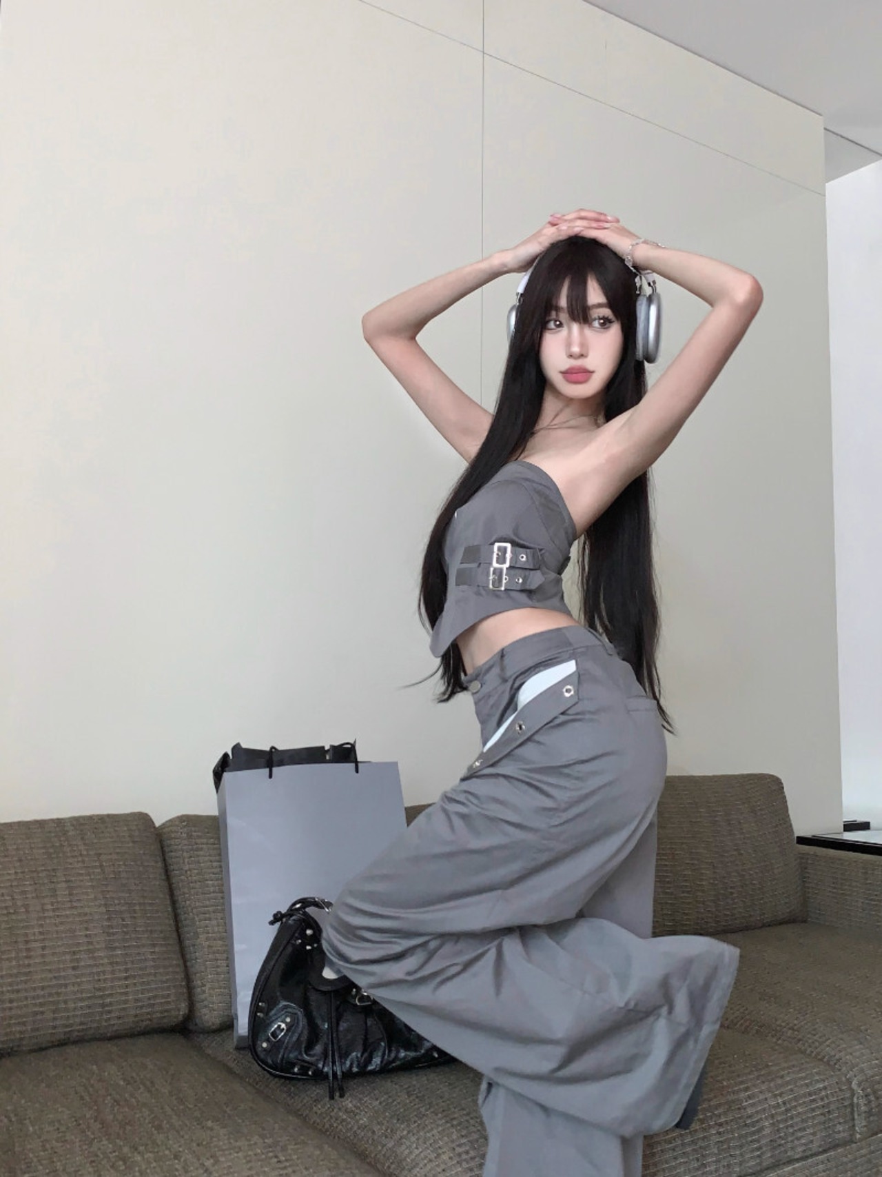 ホットガールアメリカンレトロスーツ夏グレーストラップレスベストワイドレッグロングパンツツーピースセット服 サマー 夏物 ワイドパンツ