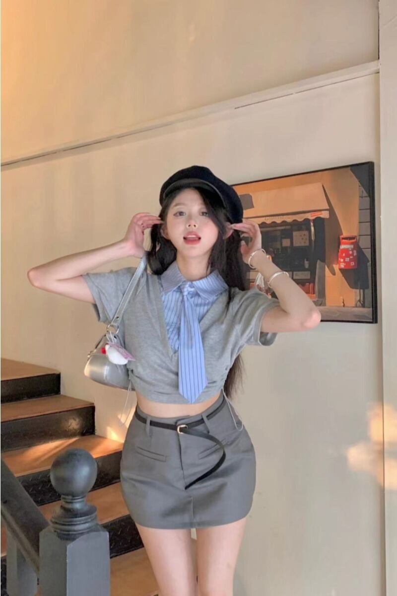 甘くてホットガールズスタイル スーツ レディース フェイク 2 ピース 半袖 トップス サマー ラップ ヒップ ミニ スカート 2 点セット 大人ガーリー スウィート キュート カジュアル 夏物