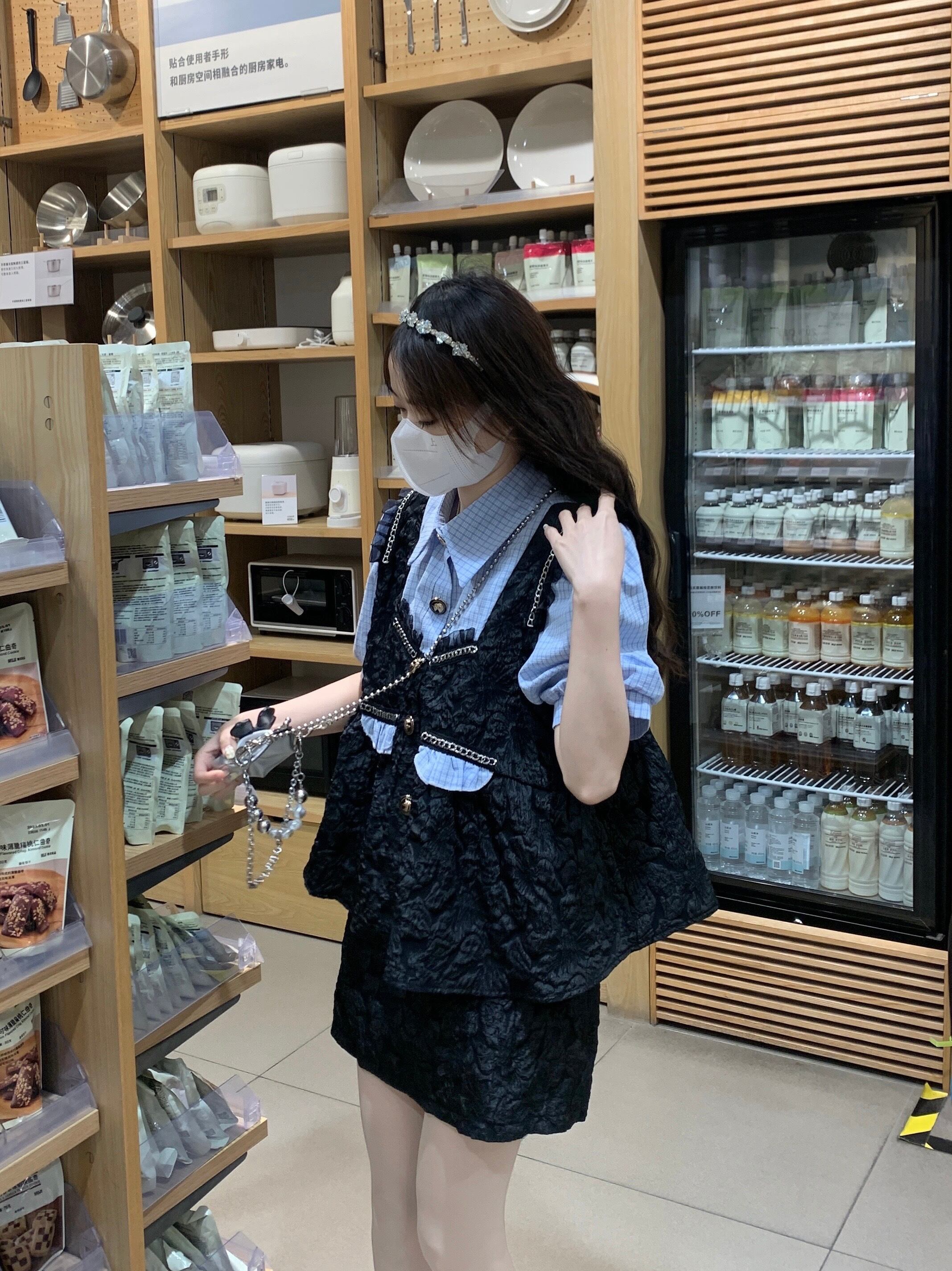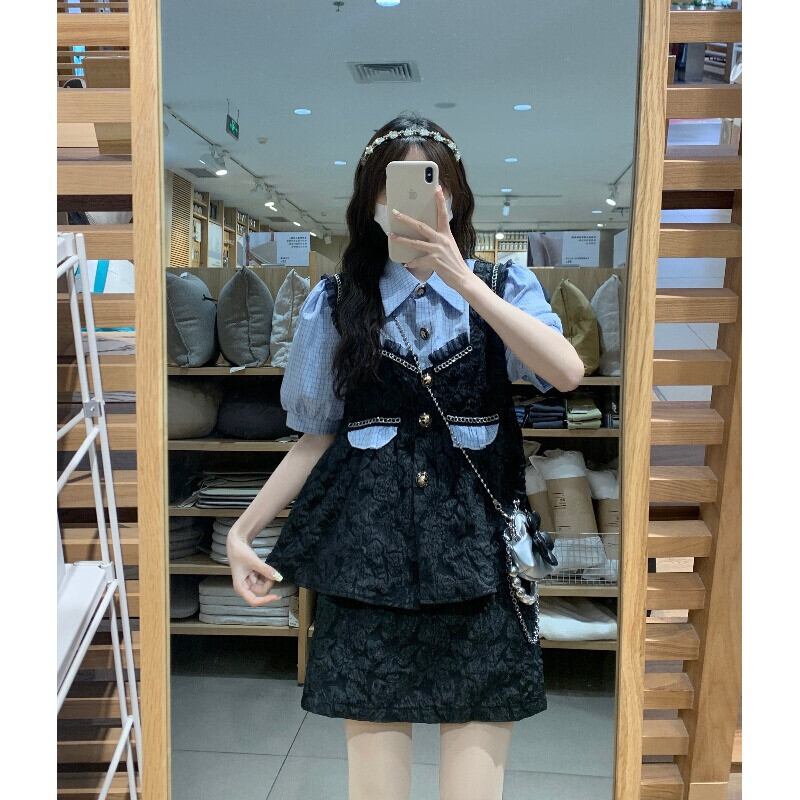 Sweet Girl フレンチ スーツ レディース バブルスリーブ ブルー チェック柄 ジャカード 半袖 シャツ ウエスト スカート 2 点セット 大人ガーリー スウィート キュート カジュアル
